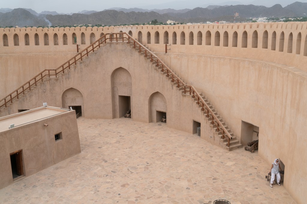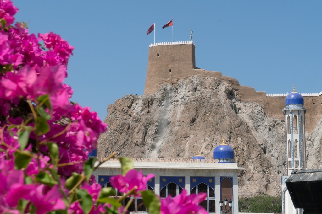 They’re big on forts in Oman. There are dozens of them, often situated on a strategic high point in the rugged, mountainous terrain that spans much of the country: the fort at Nizwa, with its single round tower 43 metres in diameter, its top circled with firing ports for cannon, is a striking example. The sultanate’s capital, Muscat, is situated on a strip of coastal plain, but even this is strewn with rocky hillsides, many of them topped with forts – some old and ruined, some very much in use, as evidenced by the serious-looking fatigue-clad sentry outside the Al Mirani fort, one of a pair of forts which flank the Al Alam palace by the old harbour. The Al Mirani and its sister the Al Jalali were built by the Portuguese during a century-long occupation: it’s an episode which features strongly in Omani history books, even if, as our Omani guide pointed out to us somewhat ruefully, it has been largely forgotten by the Portuguese.
