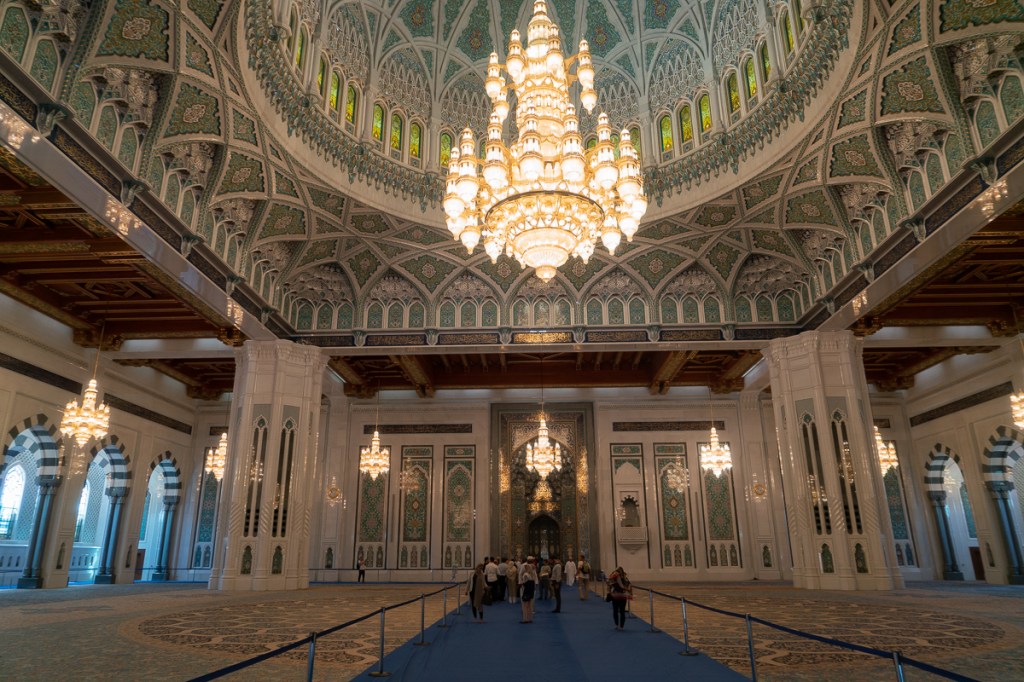 Unsurprisingly, the other most prominent landmarks are the mosques, which dominate the landscape. Omani mosque architecture seems to be never less than elegant and beautifully crafted. At its best, it’s jaw-dropping, nowhere more so than in the Sultan Qaboos Grand Mosque in Muscat, inaugurated in 2001 to celebrate 30 years of the present Sultan’s reign. The quality and quantity of the craftsmanship leave you gasping for breath, as do the elegance and proportions of the many buildings that make up the complex. The calligraphy in shining white stone around the outside of the main building, the elaborate carving on the wooden doors of the women’s prayer hall, the single piece Persian carpet that spans the whole of the men’s prayer hall (many times the size, because Omani women are permitted to pray at home, while the men are required, broadly speaking, to come to the mosque), the lighting and tiles: all are beautifully conceived and immaculately executed.