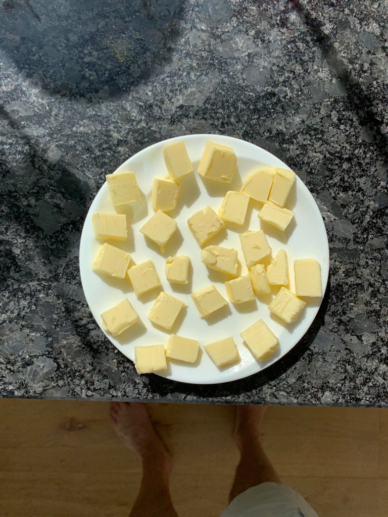 - If your butter came out of the fridge, soften. My favourite way is to cut it into small cubes and leave it in a warm place in the kitchen: five minutes in spring sunshine is plenty.