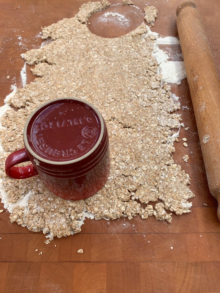 - On a floured board, roll your dough out to 4-5mm thickness. Cut a circle (I use a mug) and transfer to your baking sheet (I have to first put the mug over my hand and then thump it for the oatcake to come out). Repeat: if all is well, you should be able to get six oatcakes.