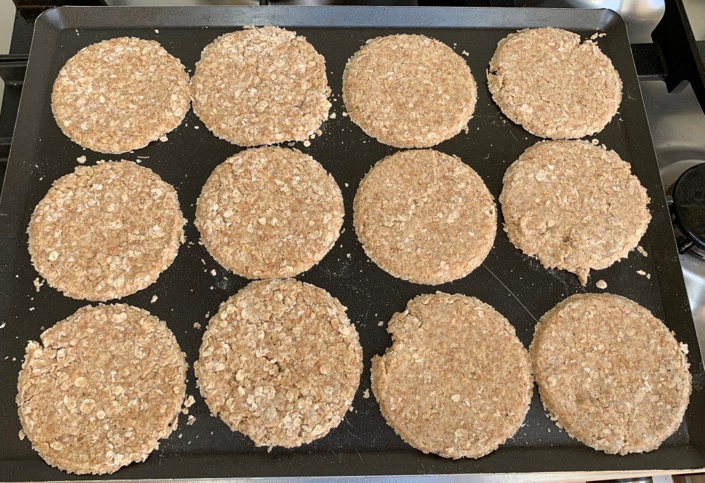 - Get a baking tray ready. If it isn’t non-stick, line it with baking paper. You’ll also need something with which to cut the oatcakes into circles: I use a fairly solid mug whose diameter is 9cm, so I just fit 12 oatcakes into my 30cm x 40cm tray.