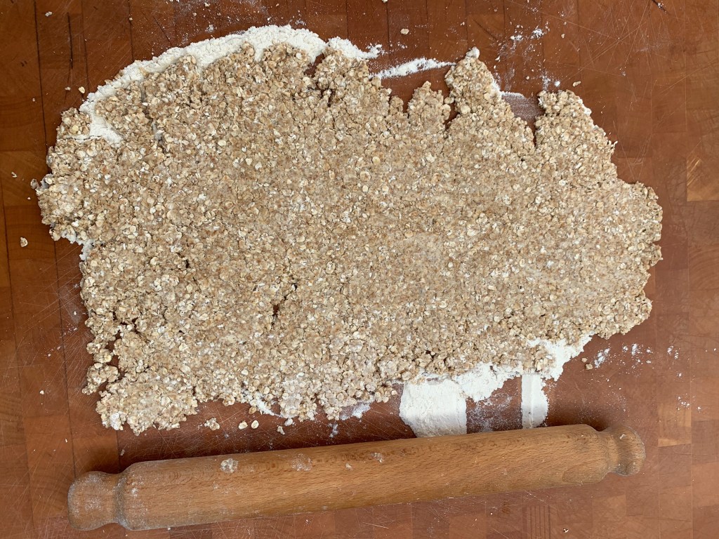 - Now gather together the off-cut dough and put it back in your bowl, add a few drops more water and recombine. You can now roll out the dough again and repeat. Hopefully, you’ll manage another four oatcakes this time.