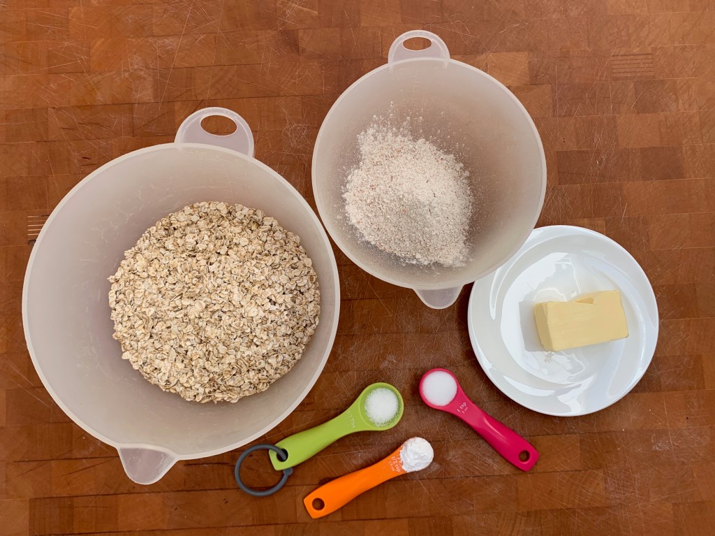 I eat between meals. Because I’m type 2 diabetic, I need things that I can snack on that are neither overly sweet (we’ll draw a discreet veil over the cake recipes in this series of posts) nor overly salty (I can eat bags of peanuts for days, but this is a terrible idea also). Scottish oatcakes contain little or no sugar, don’t have to be overly salty and are really delicious, either on their own or with a bit of cheese: in short, they are the perfect snack. And they turn out to be one of the easiest things on the planet to bake.