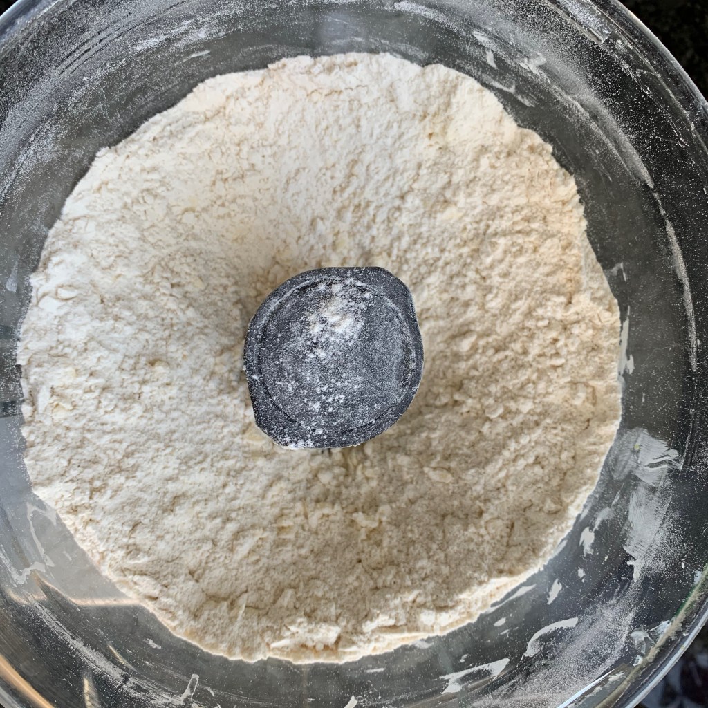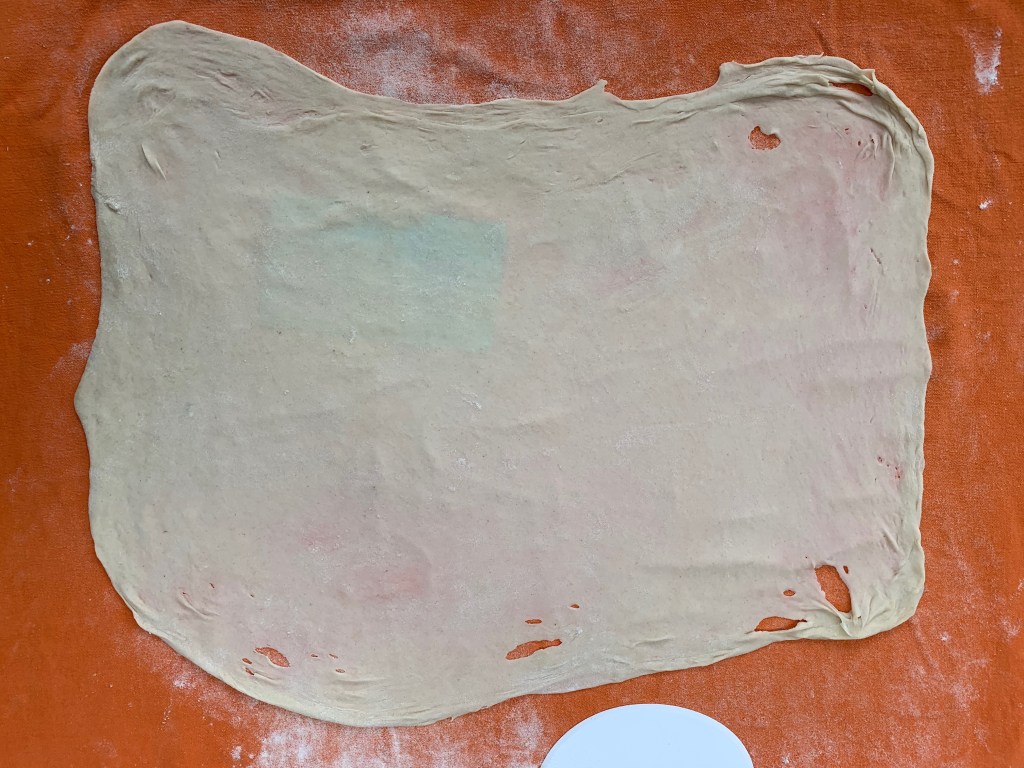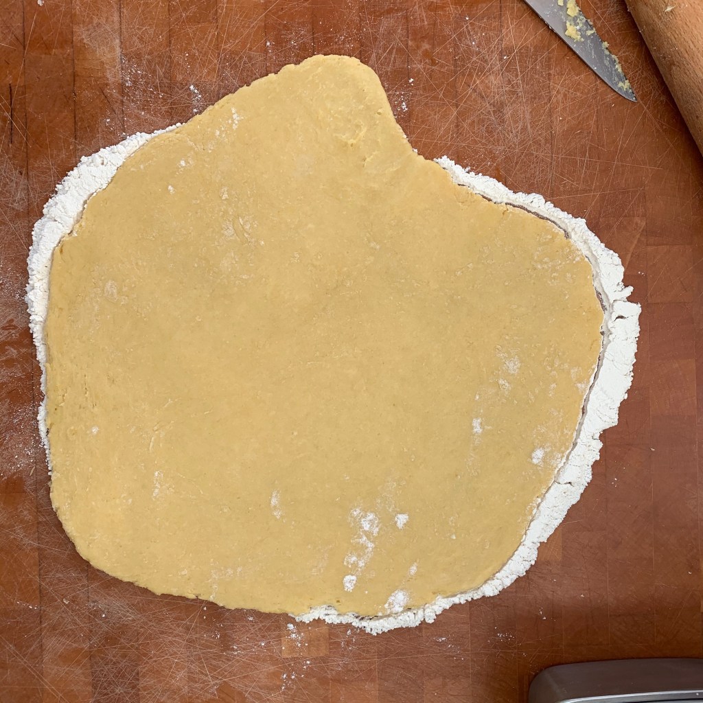 - Once the dough has finished resting, separate out one third of it and set aside. On a generously floured board, roll it out to the size of your tin with around 2cm overlap all the way round