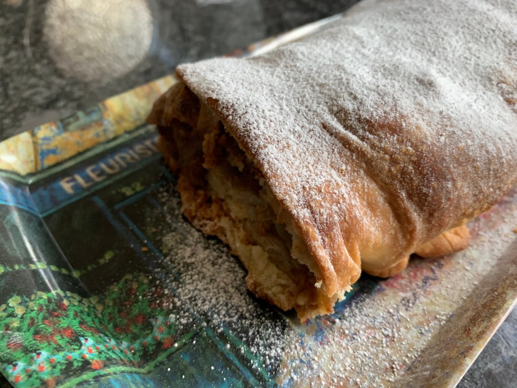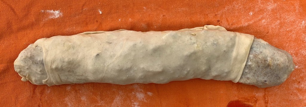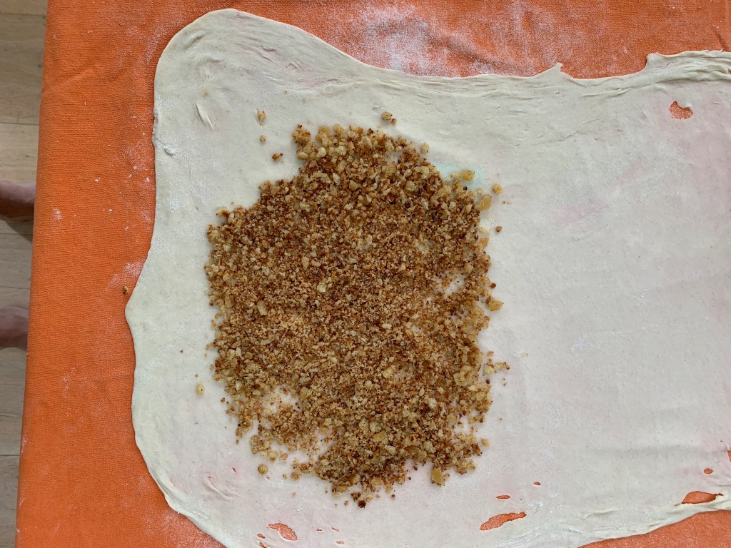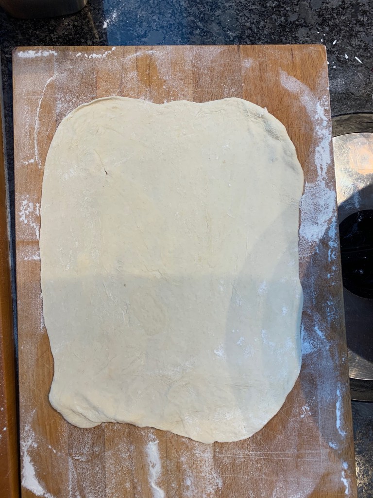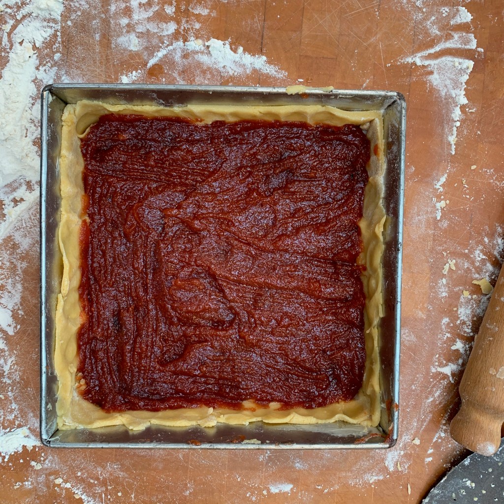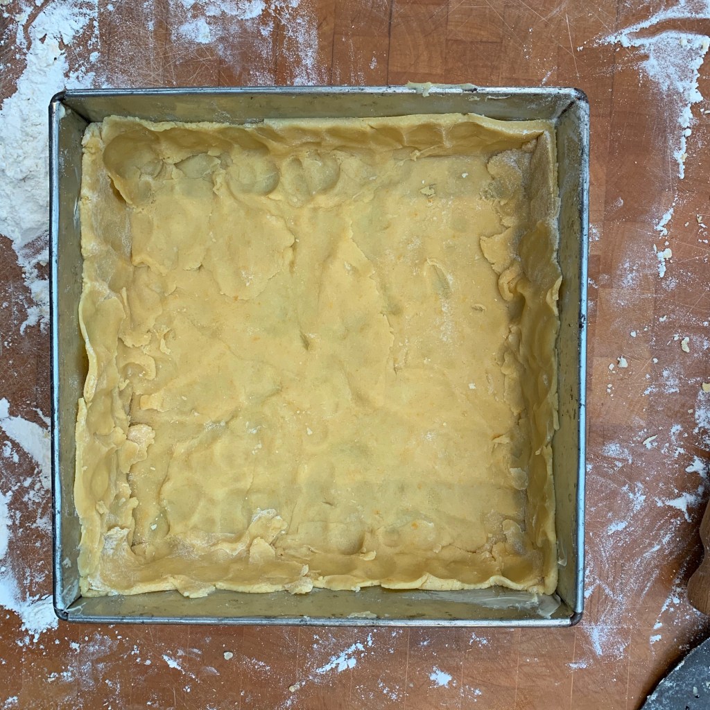 Thanks for this to my daughter’s South American colleague Daniel (who was the person who insisted that it should be included in this blog in the first place). His recipe was for about double this amount as a 40cm x 30cm traybake: I used a square tin with a removable base of around 23cm x 23cm, which left a small amount of pastry left over.