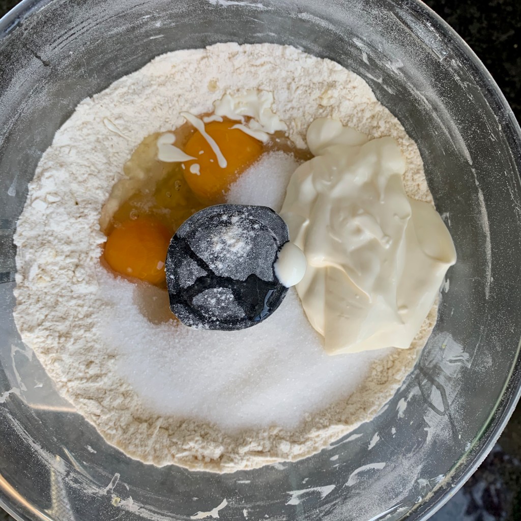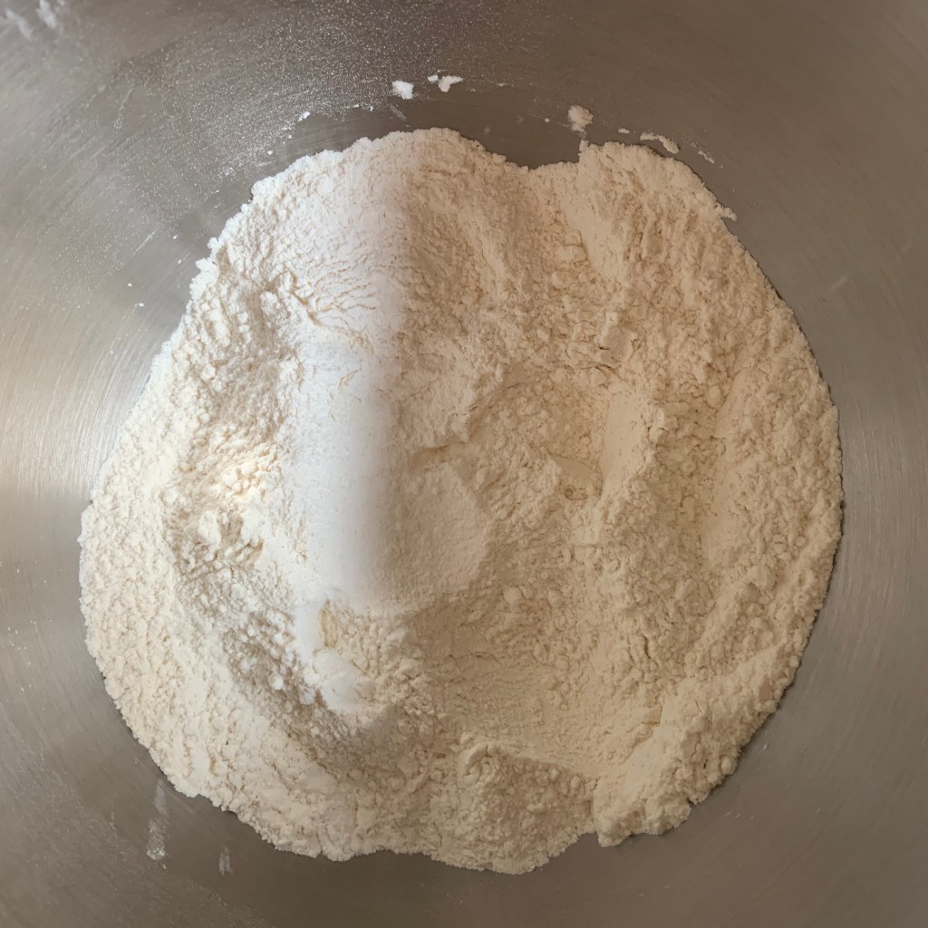 - In the bowl of your stand mixer, combine flour, sugar and baking powder and mix well
