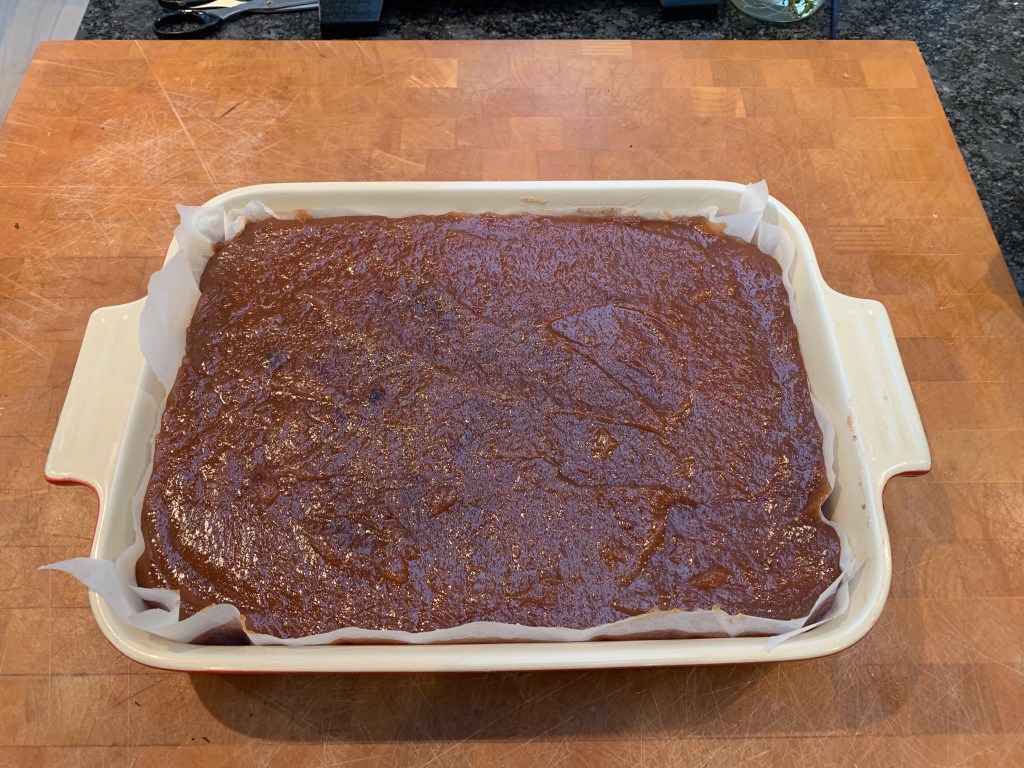 - When the mixture is a dark pink/orange, remove from the heat. Line a shallow rectangular oven dish with baking parchment and spread the mixture evenly into the dish.