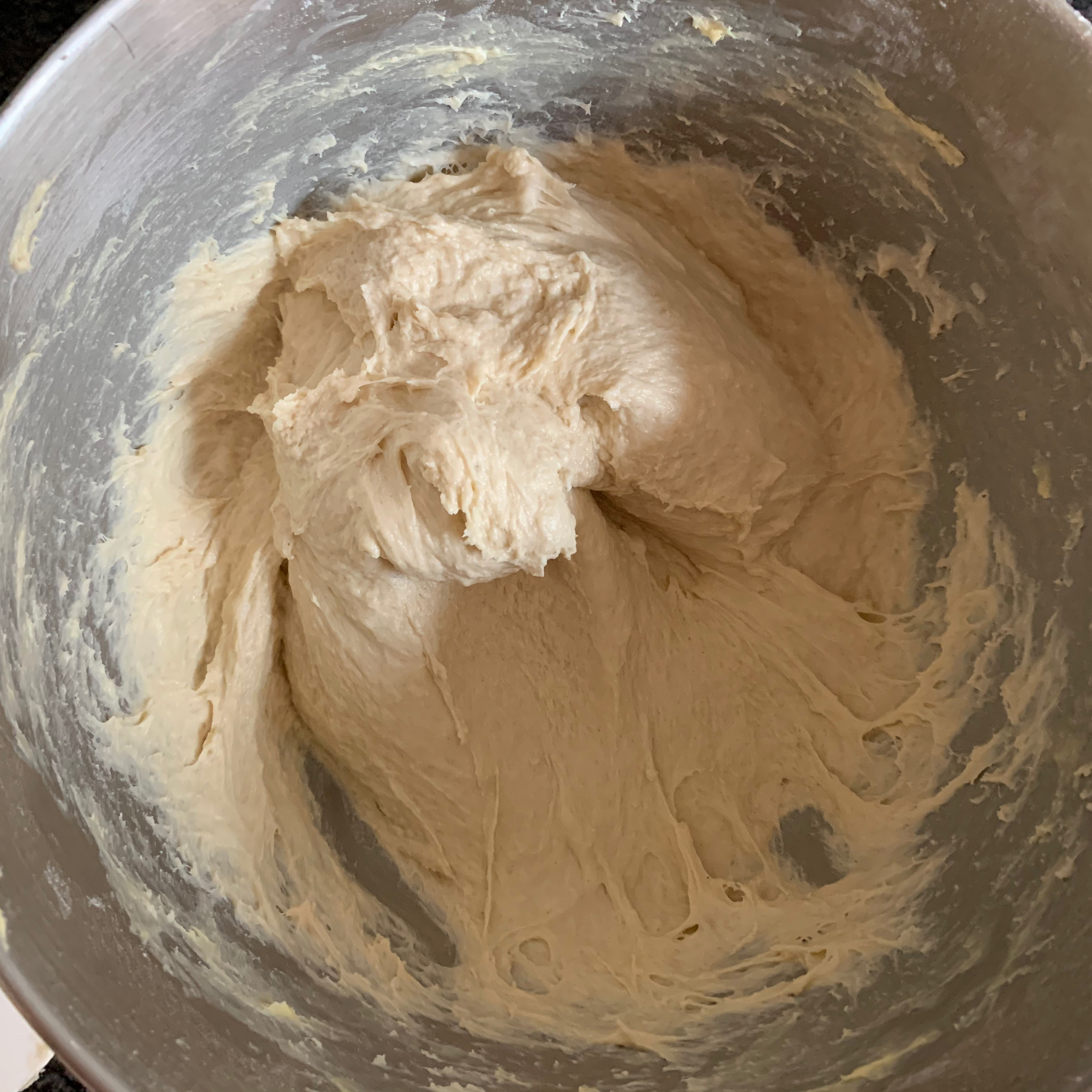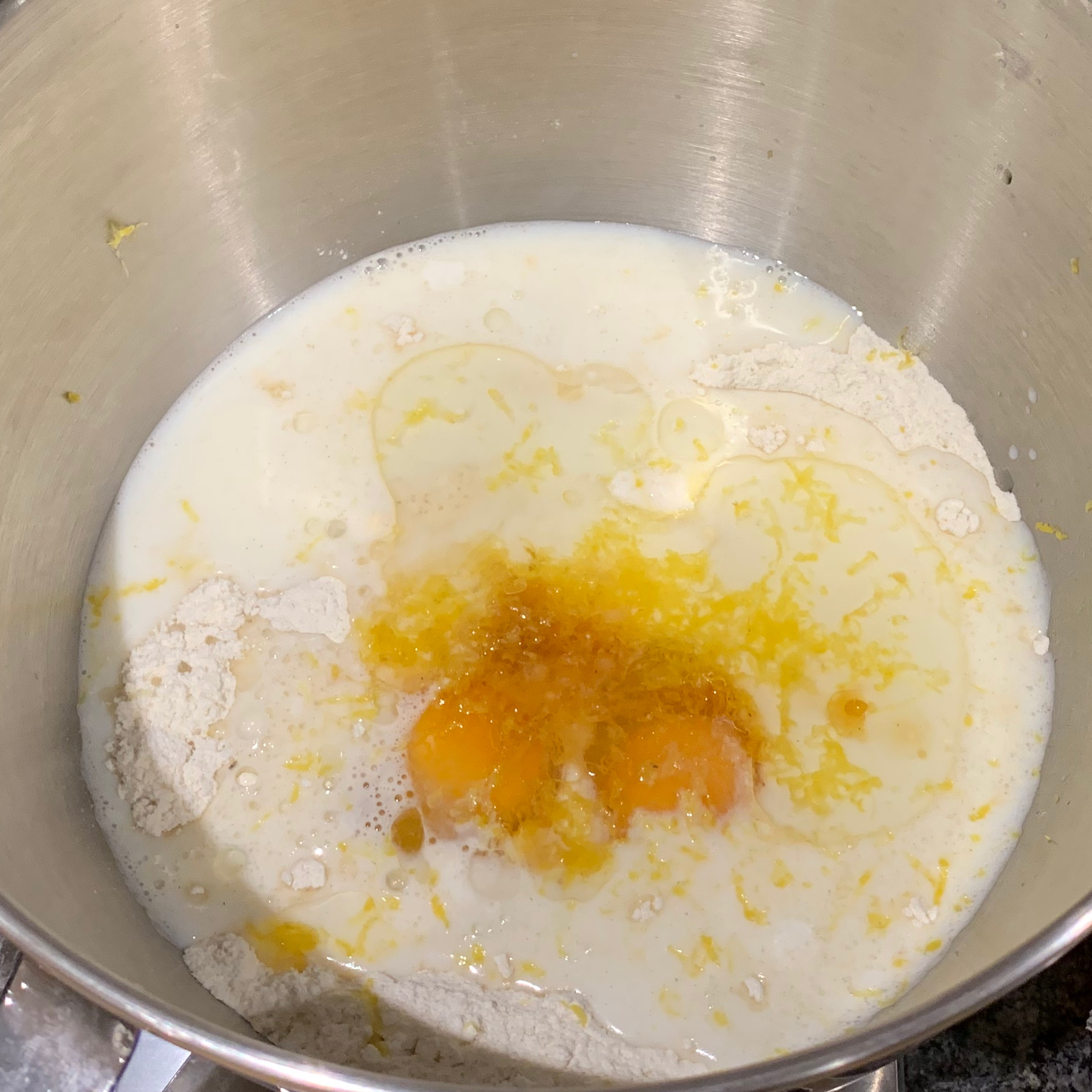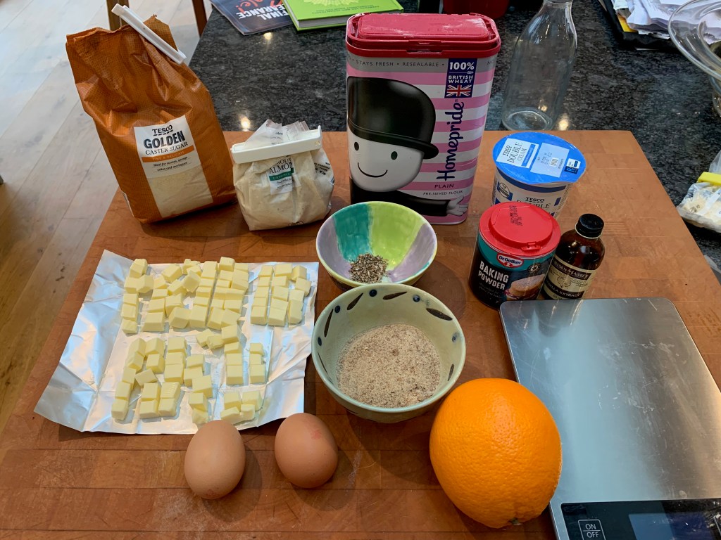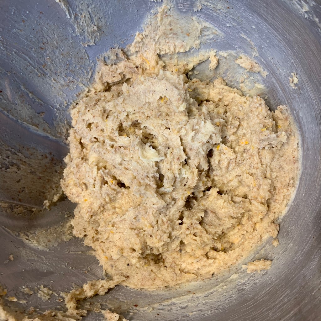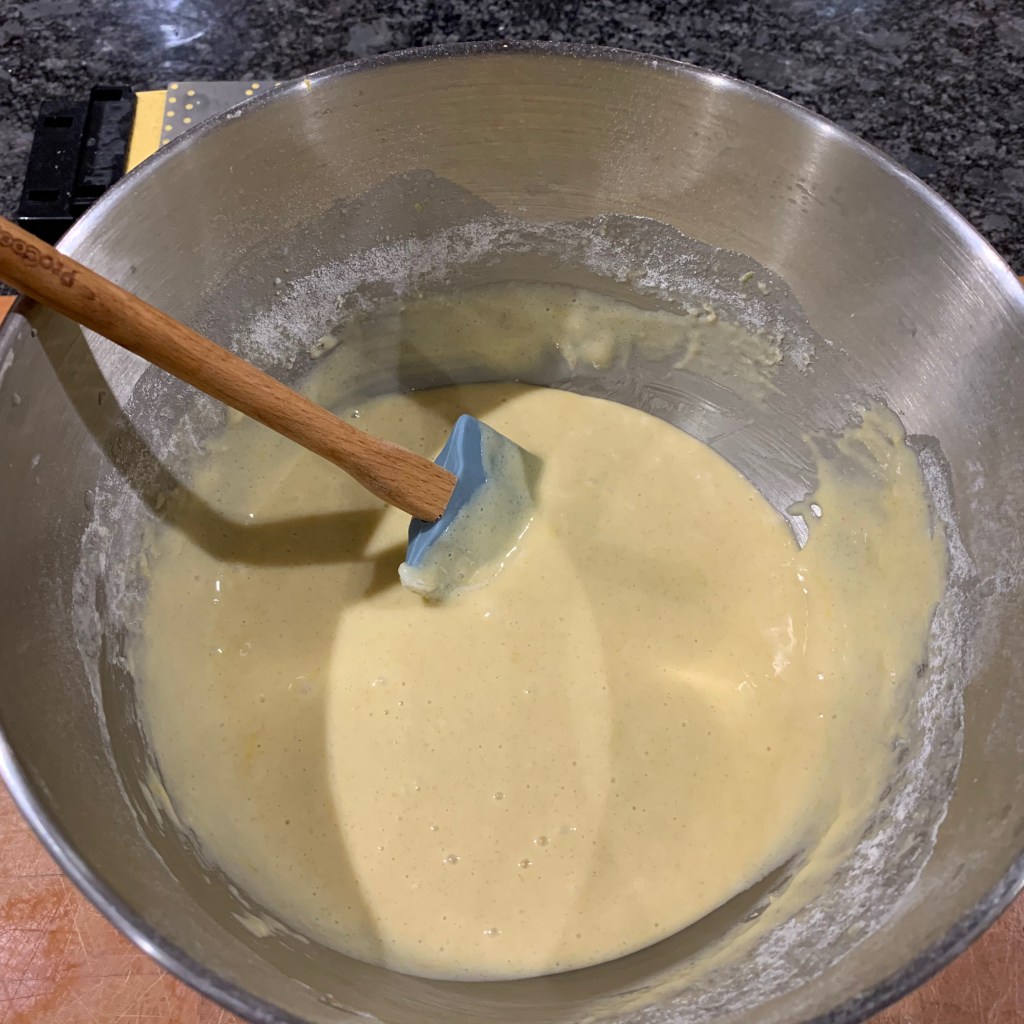- Add the orange juice, zest and vanilla essence and mix thoroughly. You should now have a fairly thick, sticky batter.
