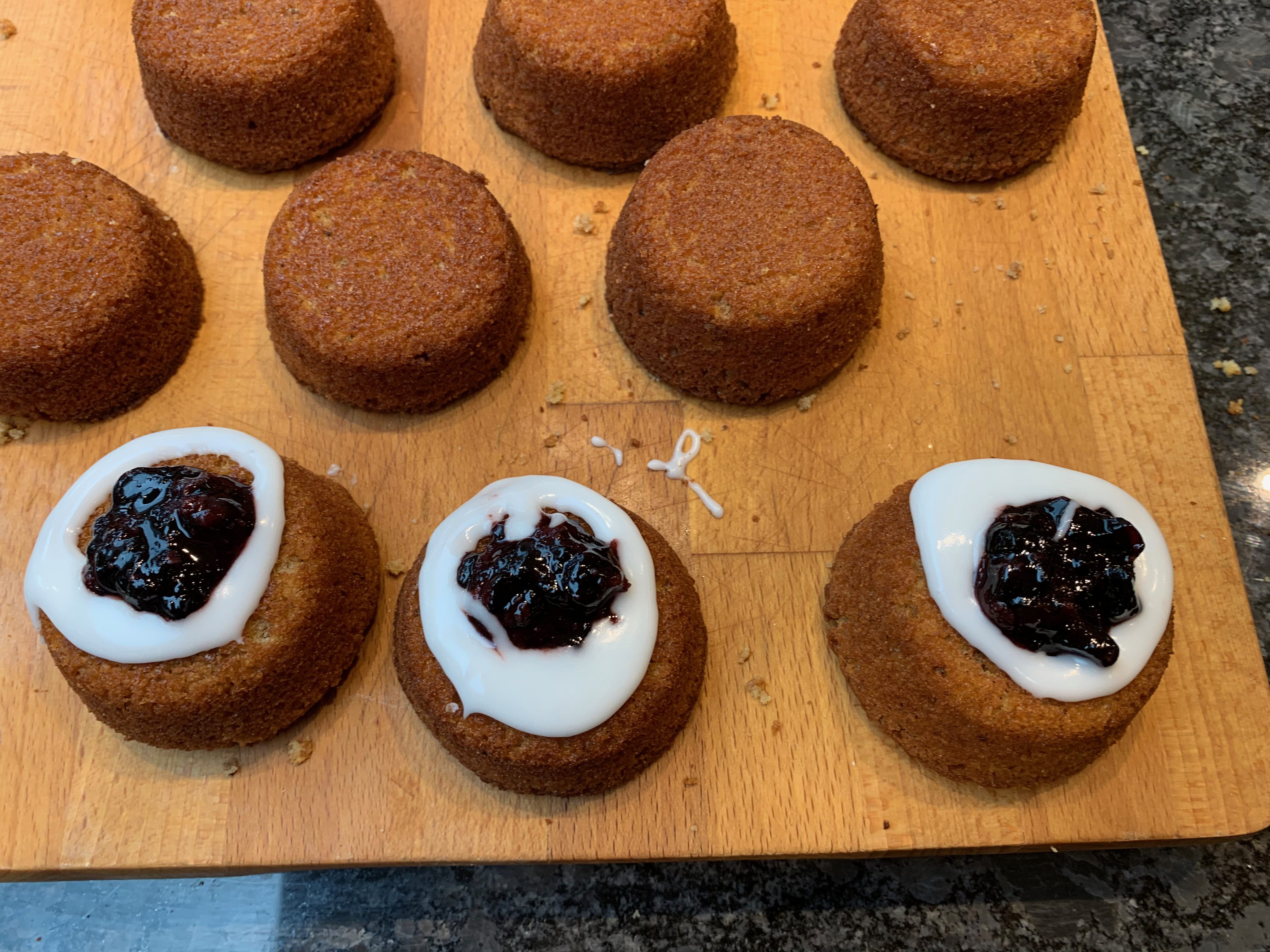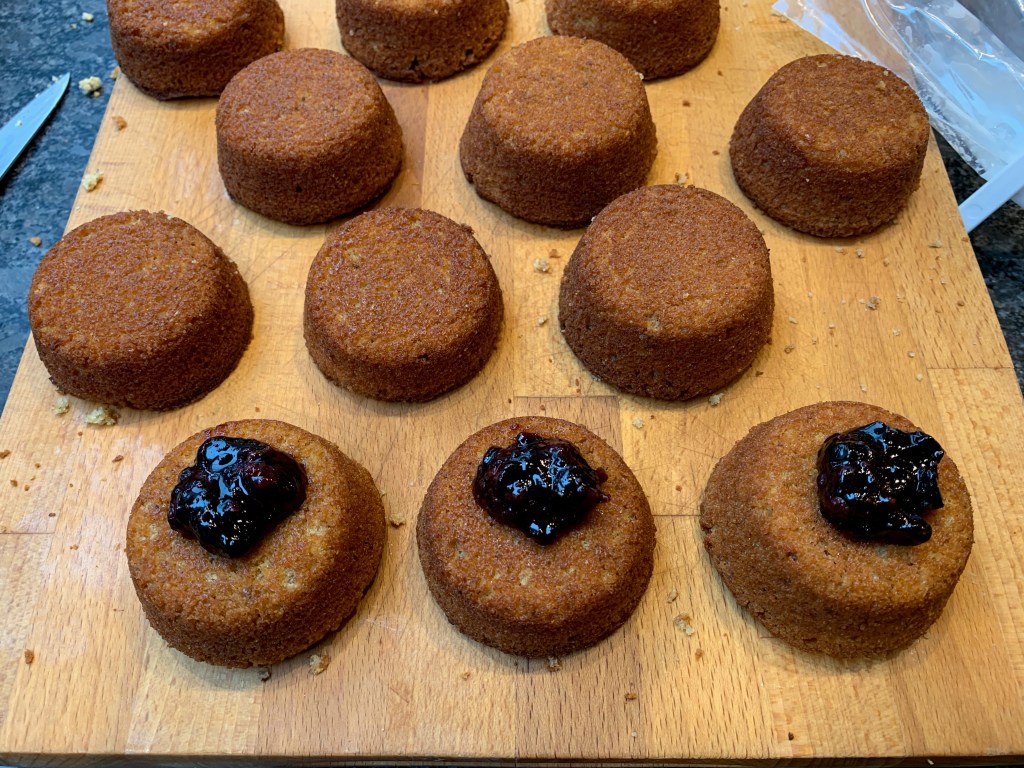 - Pipe a circle of icing around the top of each cake. Put a dollop of jam into the middle of the circle. I found this easier than the original recipe, which suggests doing the jam first (as per the photos).