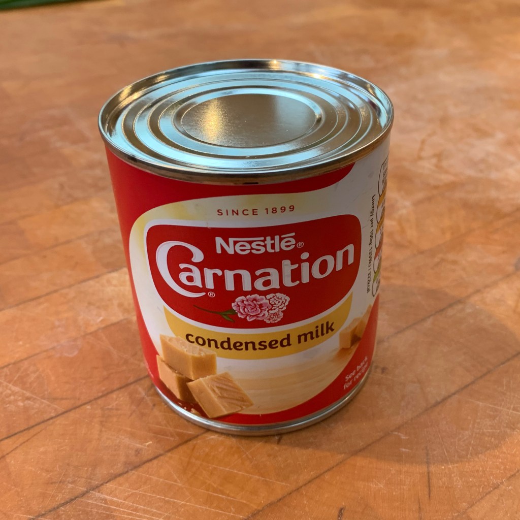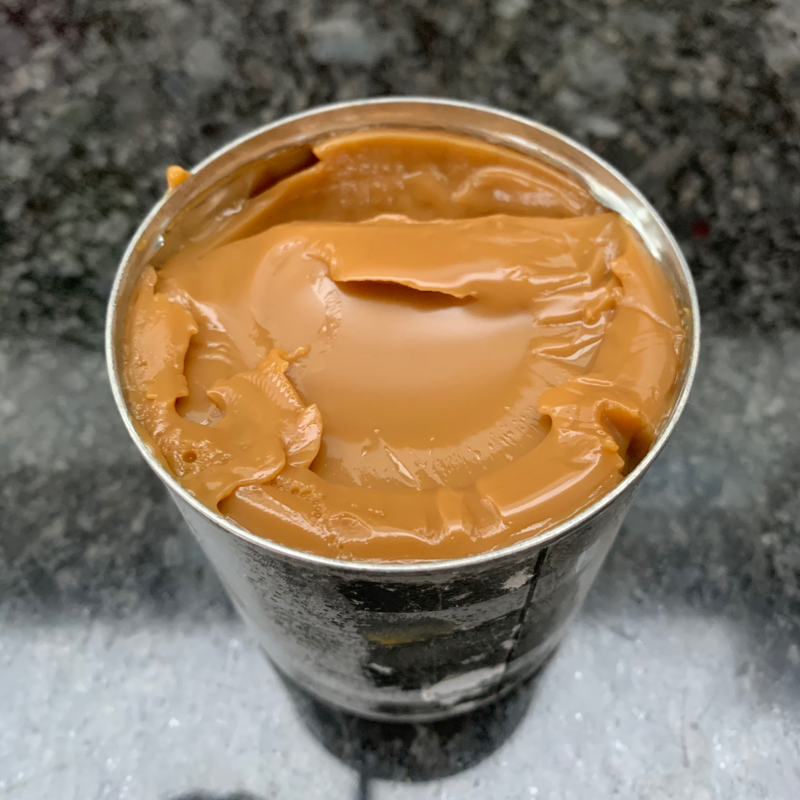 Put the tin of condensed milk (unopened, but you may want to take the paper off) into a saucepan, pour water to cover it (with some spare, since it will evaporate), and bring it to the boil.