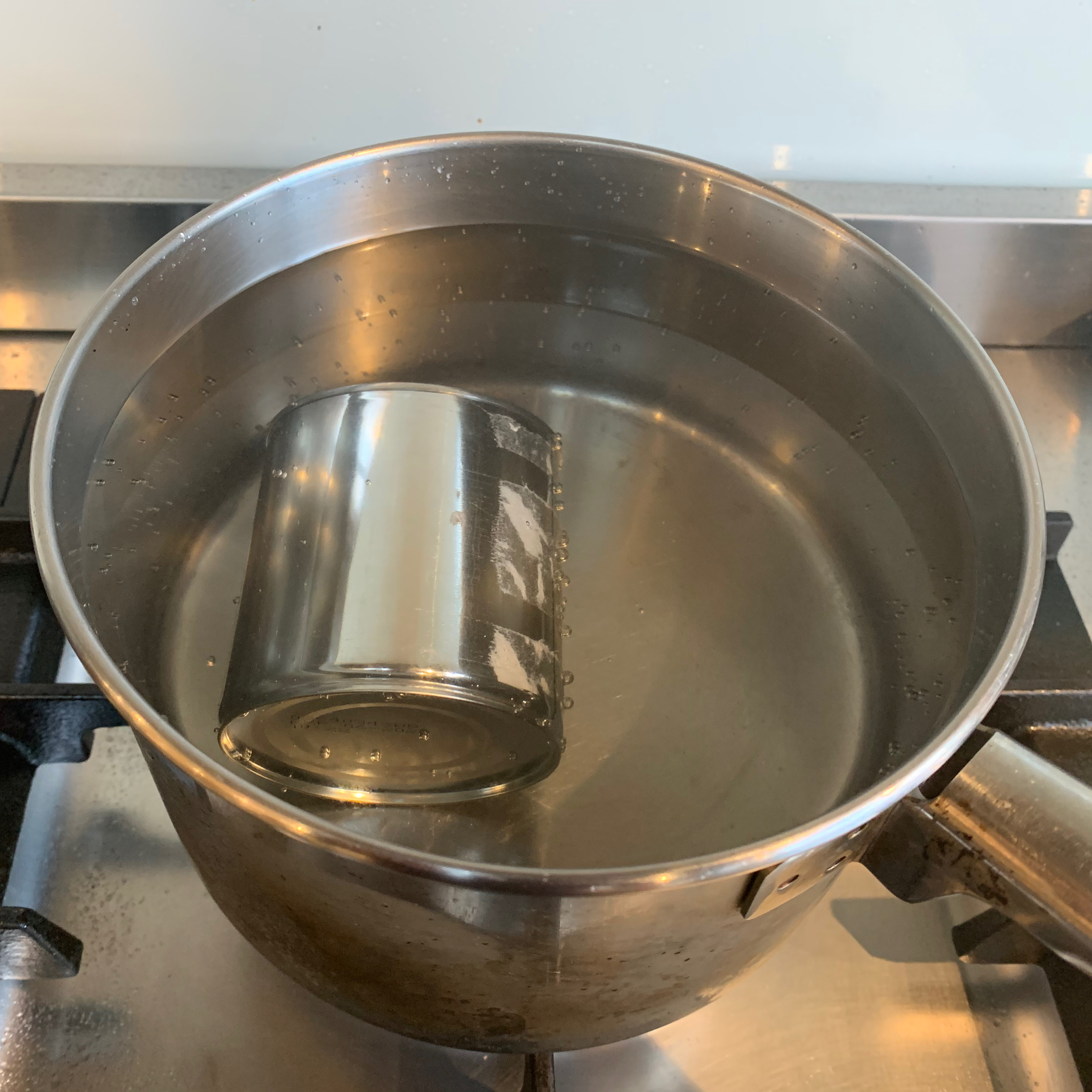 Prepare a double boiler by bringing water to the boil in a saucepan which should be just under the diameter of a non-stick frying pan that you place above it.