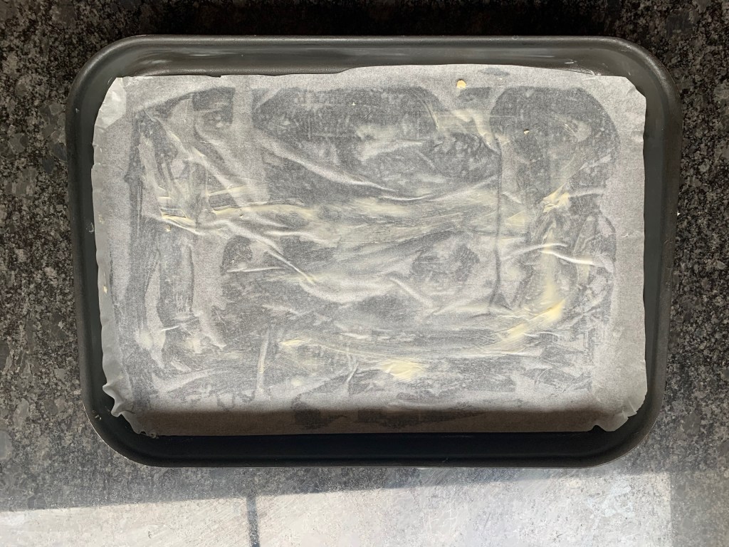 Grease your tin with butter, then line it with baking paper, then grease the baking paper generously.