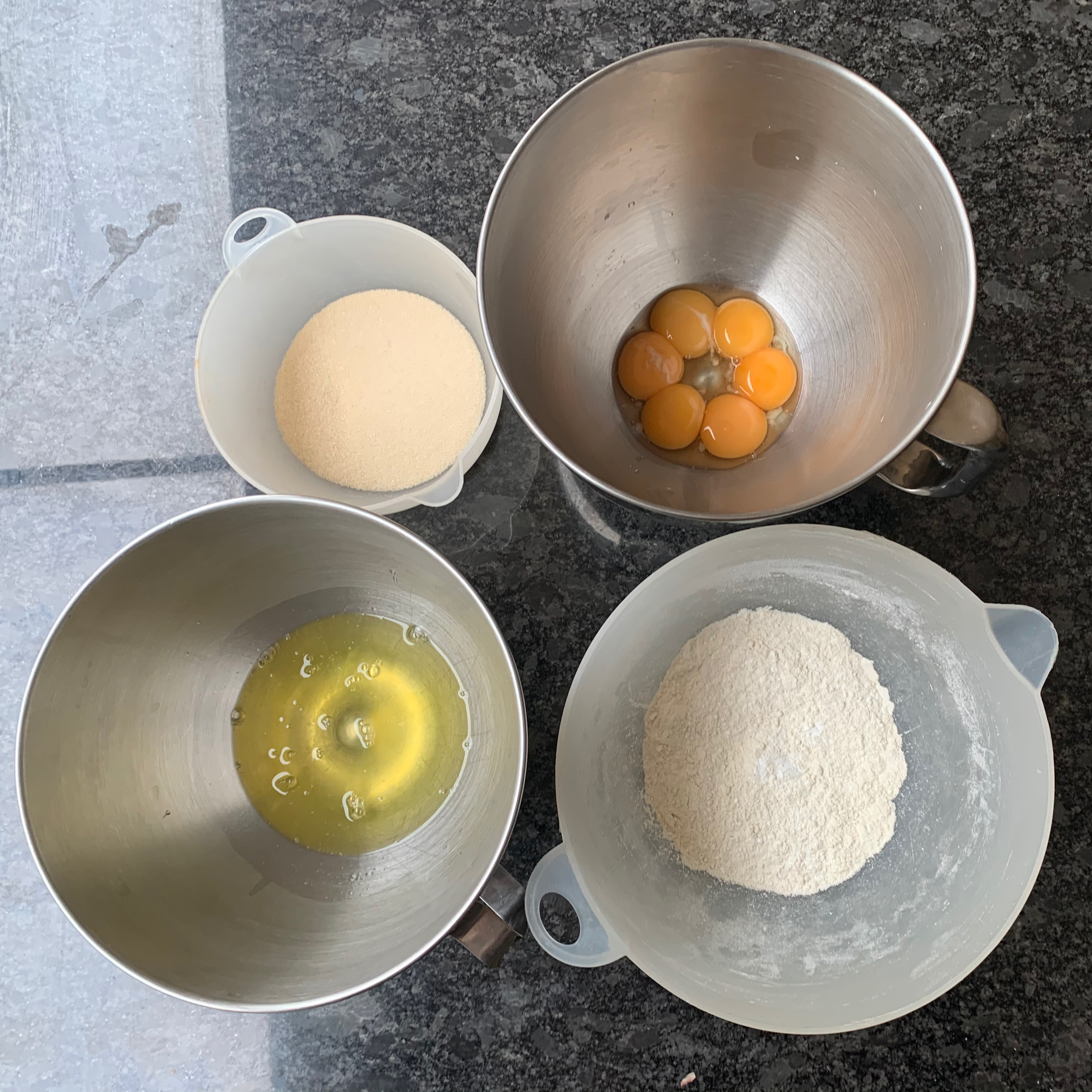 Beat the egg yolks and add half the caster sugar. Then add the flour and baking powder and mix until well blended. The mixture will be quite stiff.