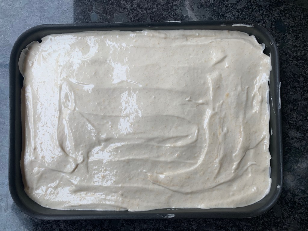 Spread the mixture evenly into your tin. Ideally, use an offset spatula to get it really level (I don’t have one, so I just did my best.