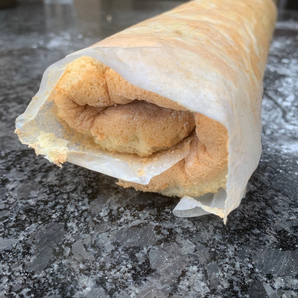 The tricky part of making a roll cake – especially one as light an airy as this – is to roll it up without tearing. I wasn’t 100% successful, but it was good enough.