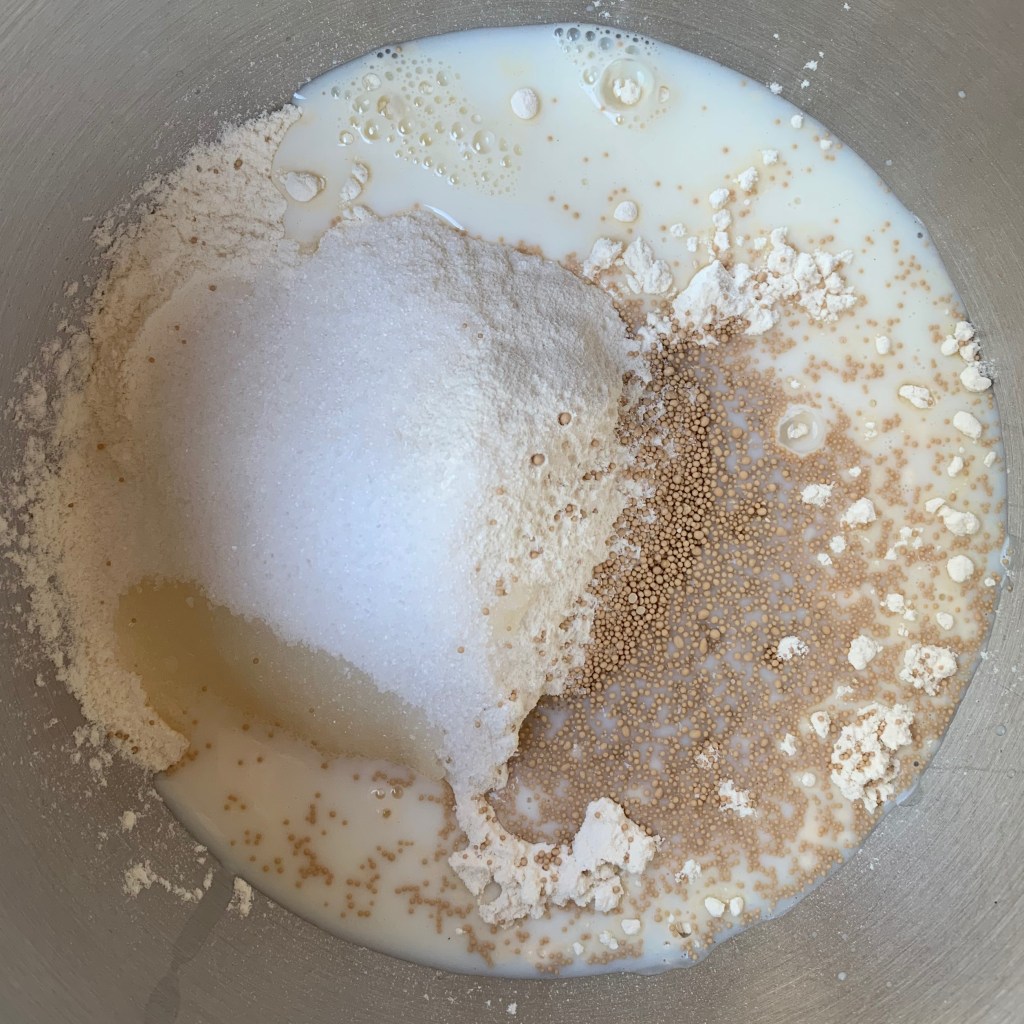 In your stand mixer, combine 300g of the flour, 60g of the sugar, the yeast and milk and mix until reasonably smooth. Cover and leave to rest for an hour.