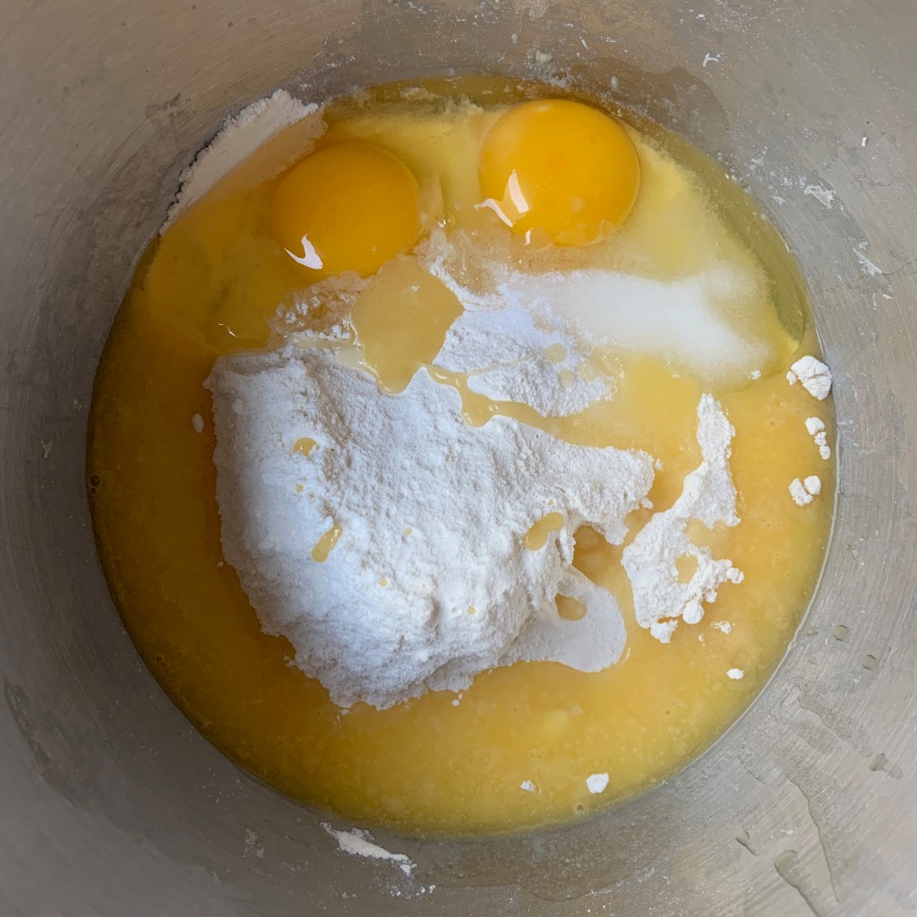 Melt the butter. Add it to the mix with the eggs, the salt and the rest of the sugar and the flour. With the dough hook, knead for 5-7 minutes.