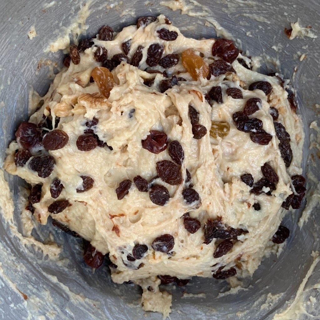 You can use pretty much any dried fruit you like. I couldn’t get glacé cherries, which looked nice in the original recipe.