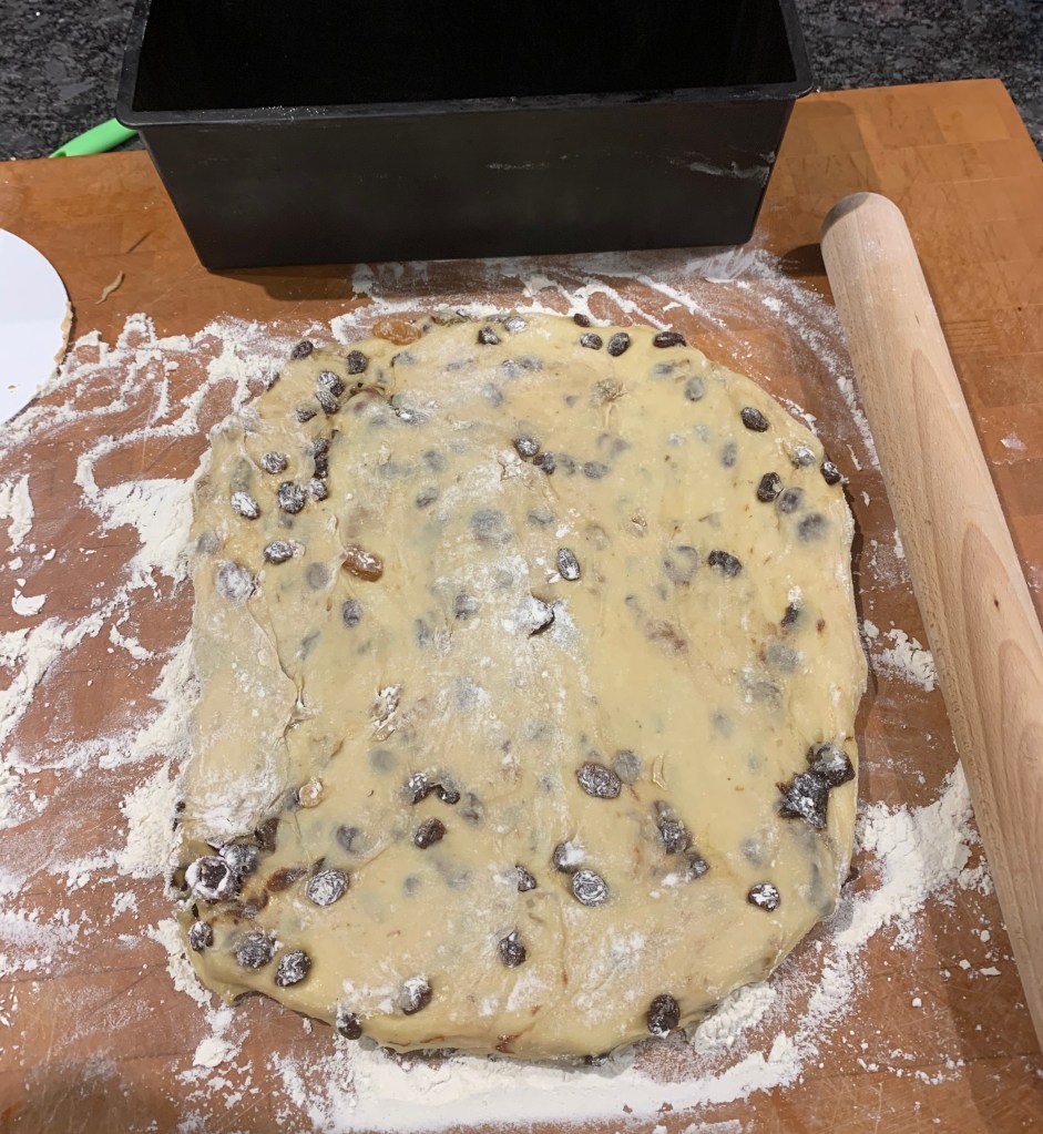 Flour a surface and roll out your dough into a rectangle. The width of your rectangle should be somewhat under the length of your loaf tin; the length around 1½ times the width.