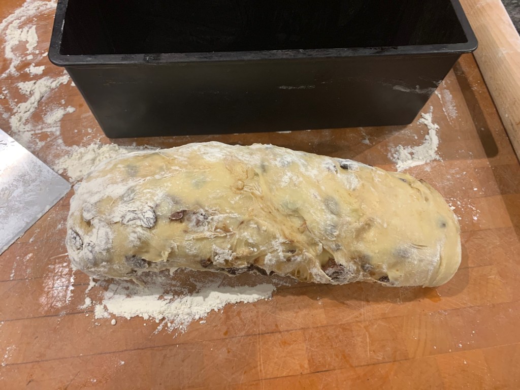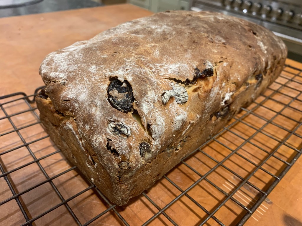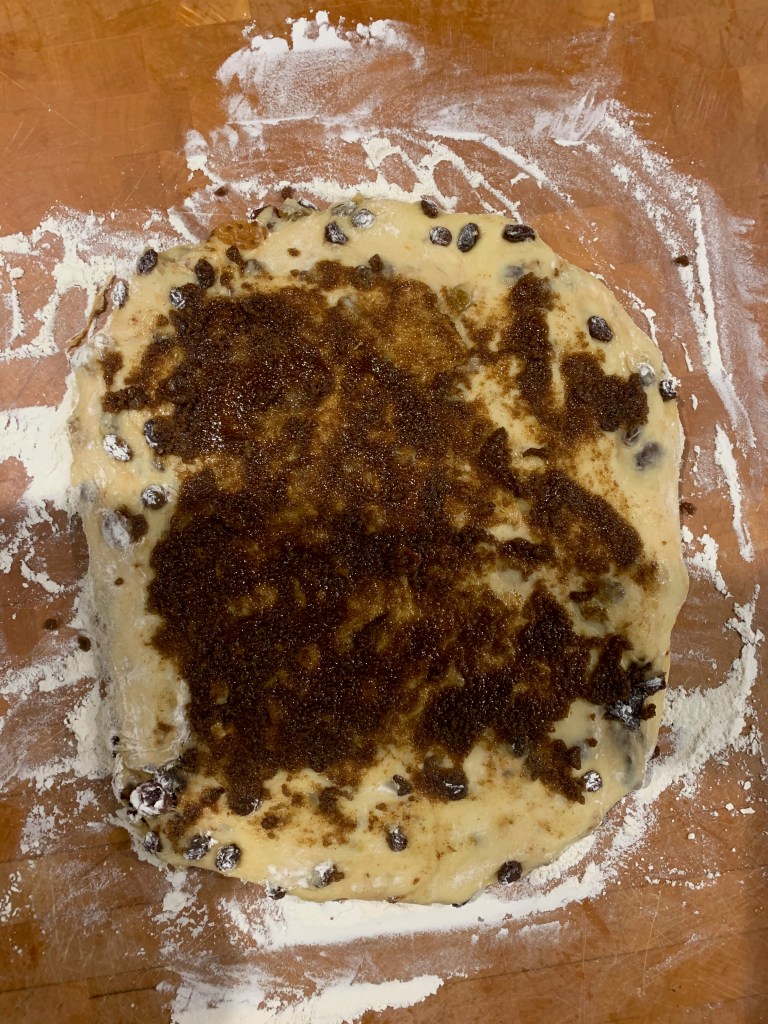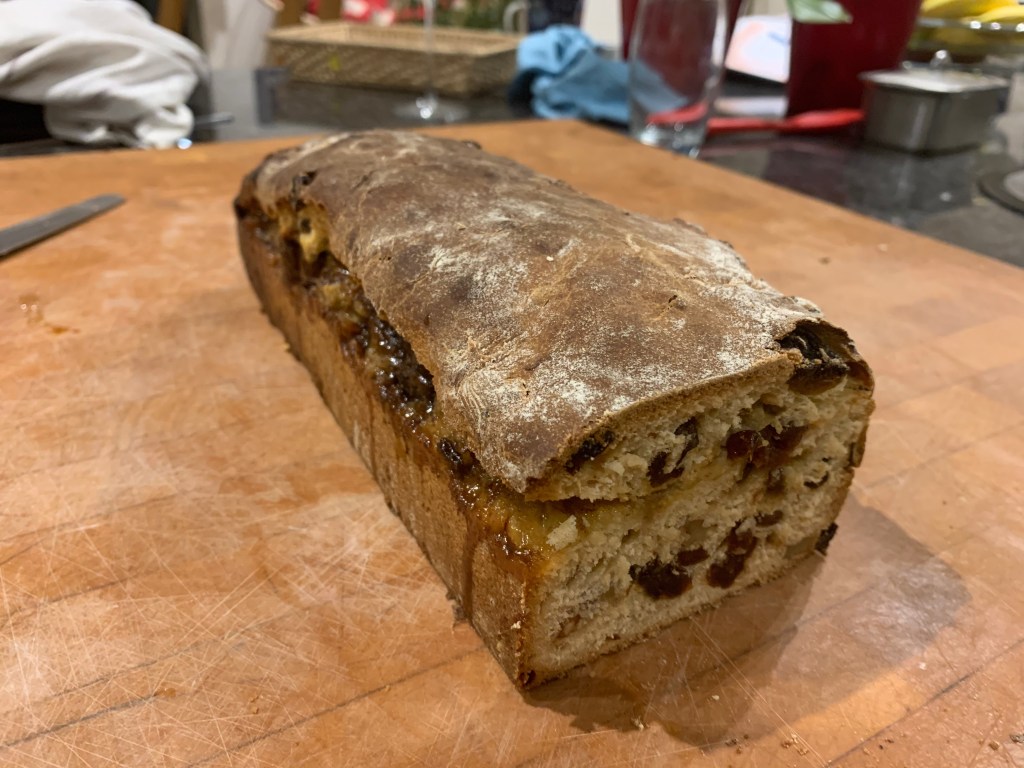 The result is a bit like a giant, fruit studded cinnamon bun. It’s great for slicing and storing in the freezer for a ready supply of snacks. The recipe doesn’t need excessive amounts of work, but it needs a lot of elapsed time – there are multiple rises which can each take a couple of hours, depending on the temperature of your kitchen. Start early.