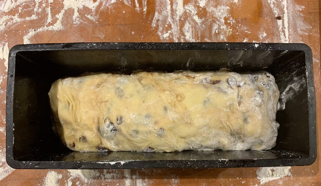 Roll up the dough into a thick sausage, ensuring the filling is sealed inside. Transfer the sausage into your loaf tin.