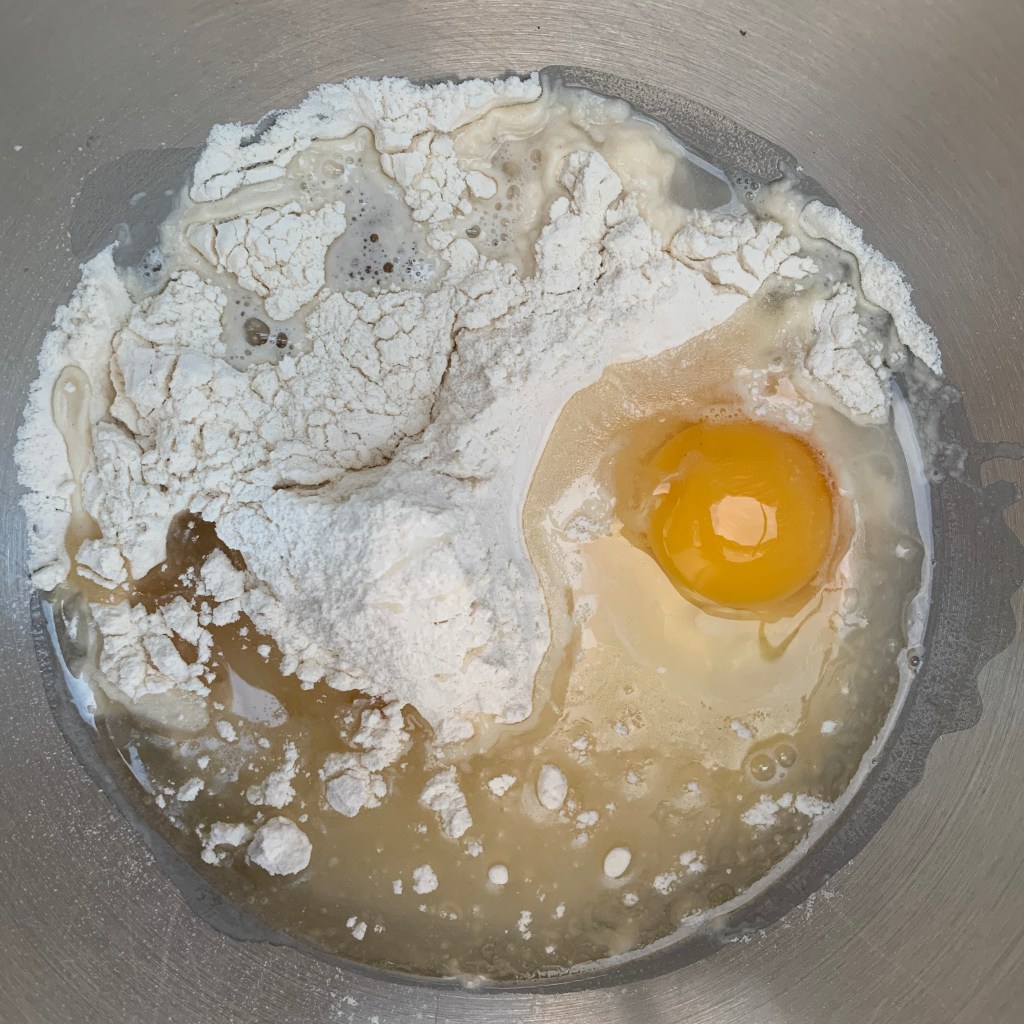 - Once the milk has cooled to around 40℃, add the yeast, sugar and around half the beaten egg. Keep the rest of the egg: you’ll be using it shortly.