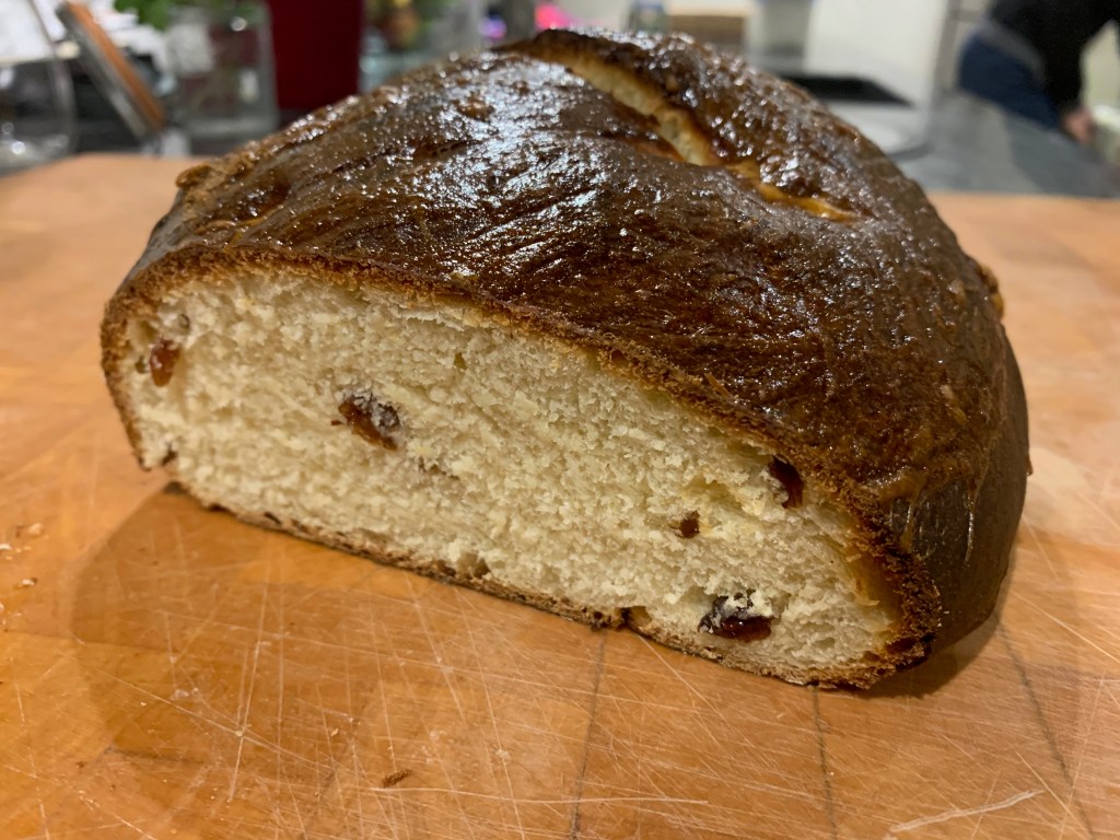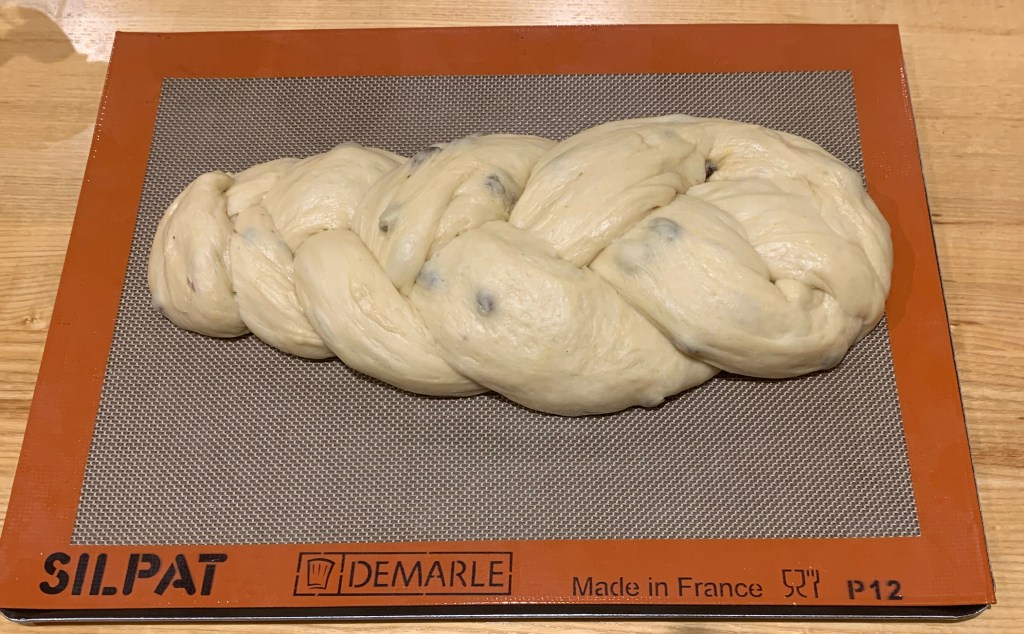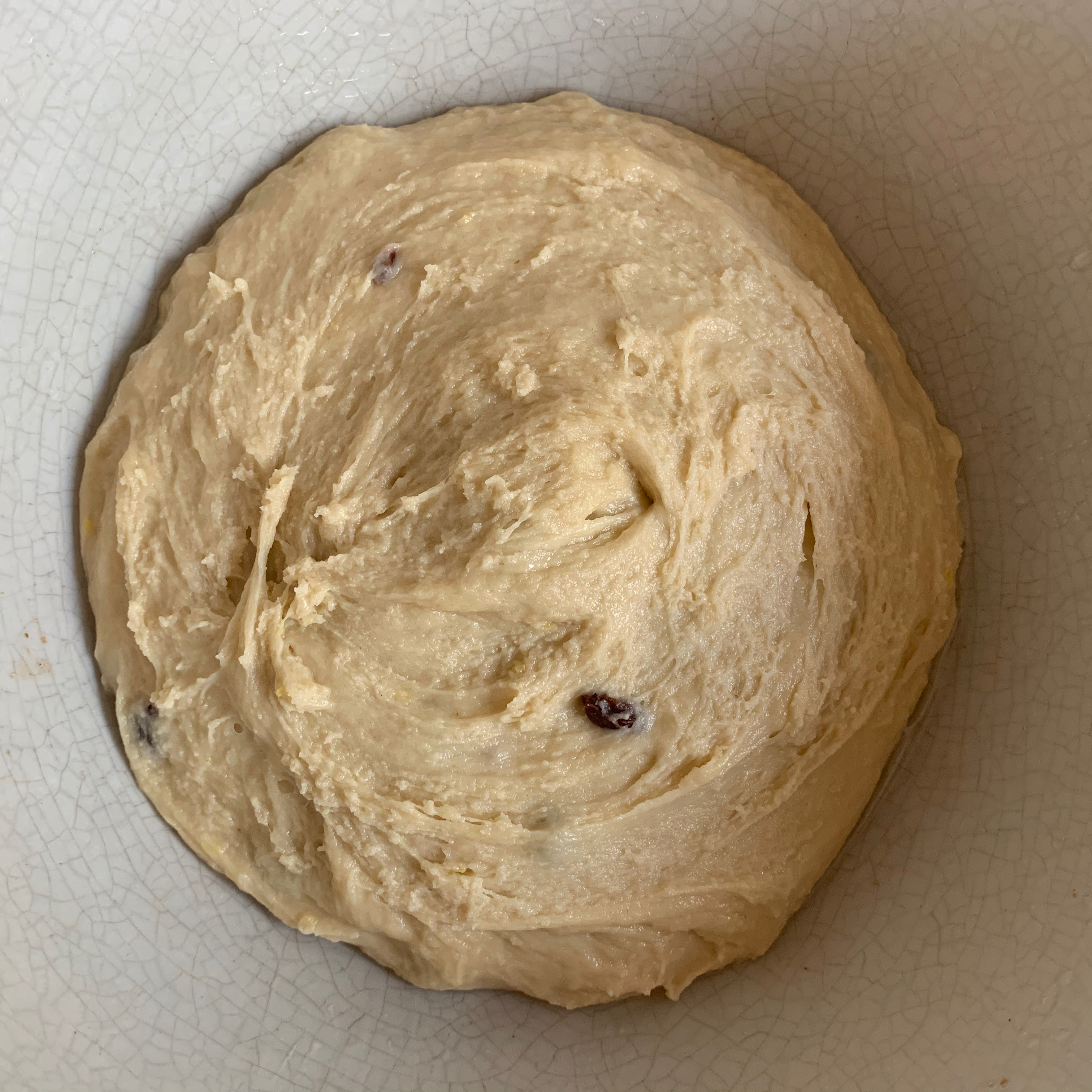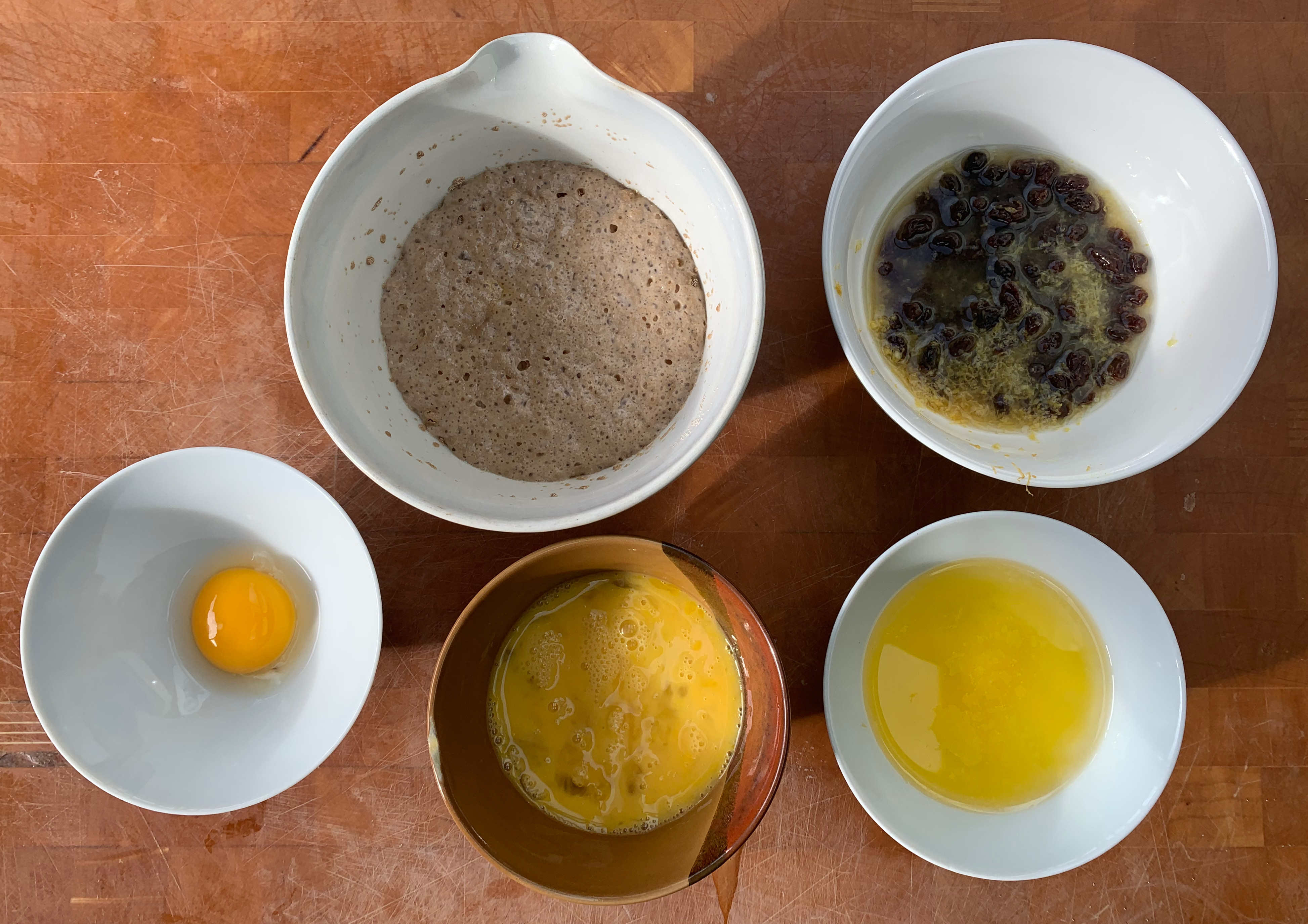 This is a braided loaf, not so far off a Jewish Challah, but sweeter and with the addition of lemon and rum-soaked raisins. It’s not massively difficult in essence, but set aside a good amount of time for the three rises that will be needed. I’ve started with a recipe from The Spruce Eats (another of Barbara Rolek’s), halved the quantities as best I could, and broken the recipe up into several stages so that it’s easier to see which ingredients you need for which stage.