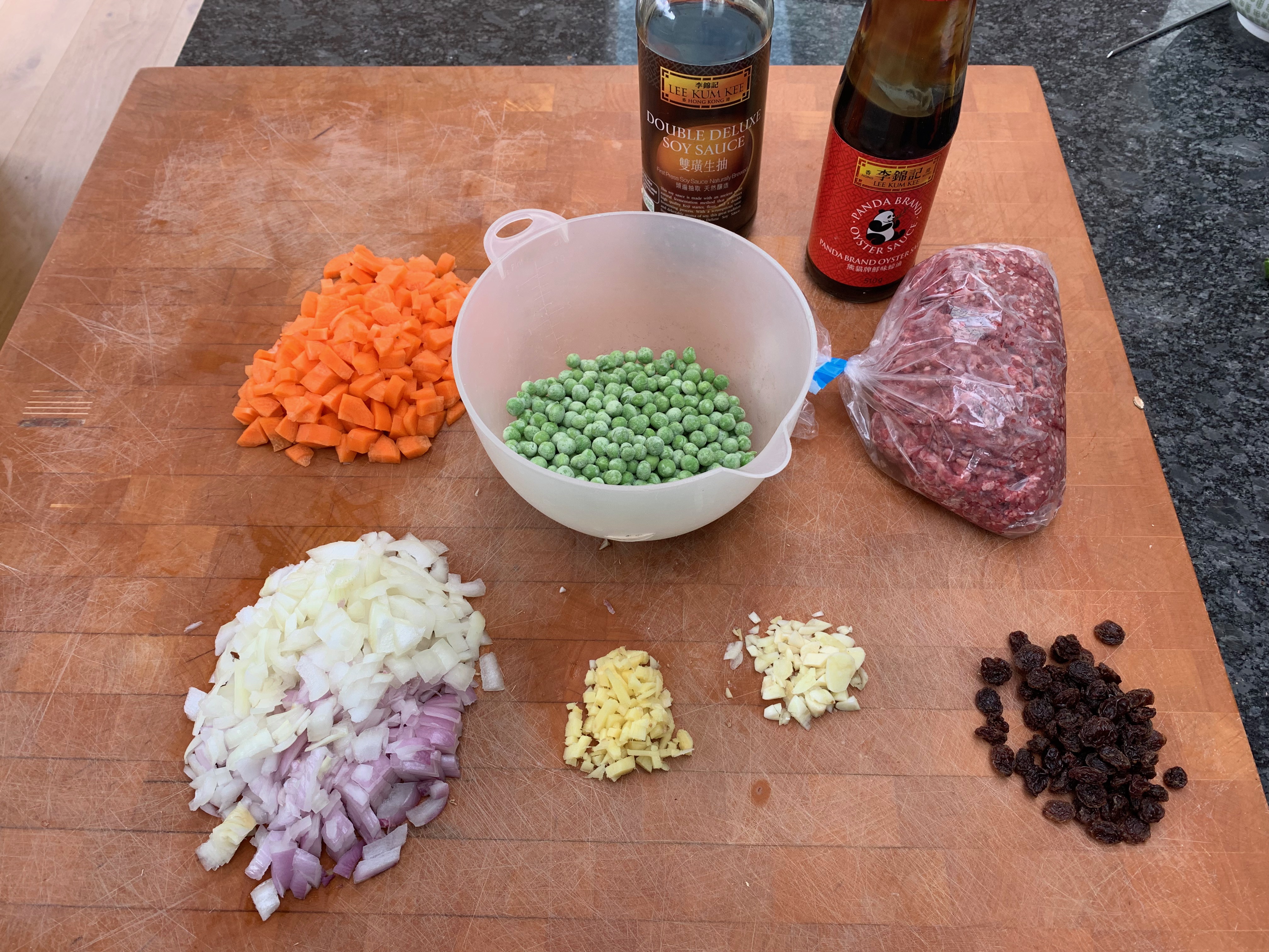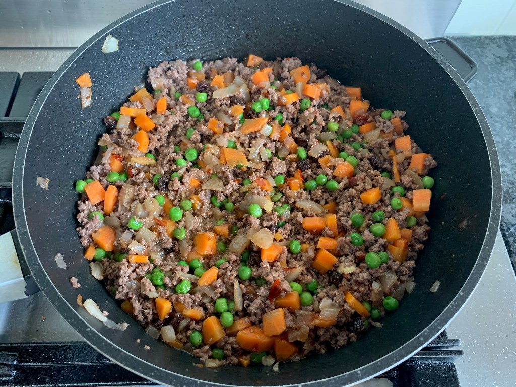 Add the minced beef and keep stir-frying until you can’t obviously see any pinkness.