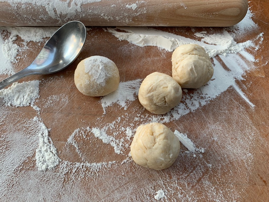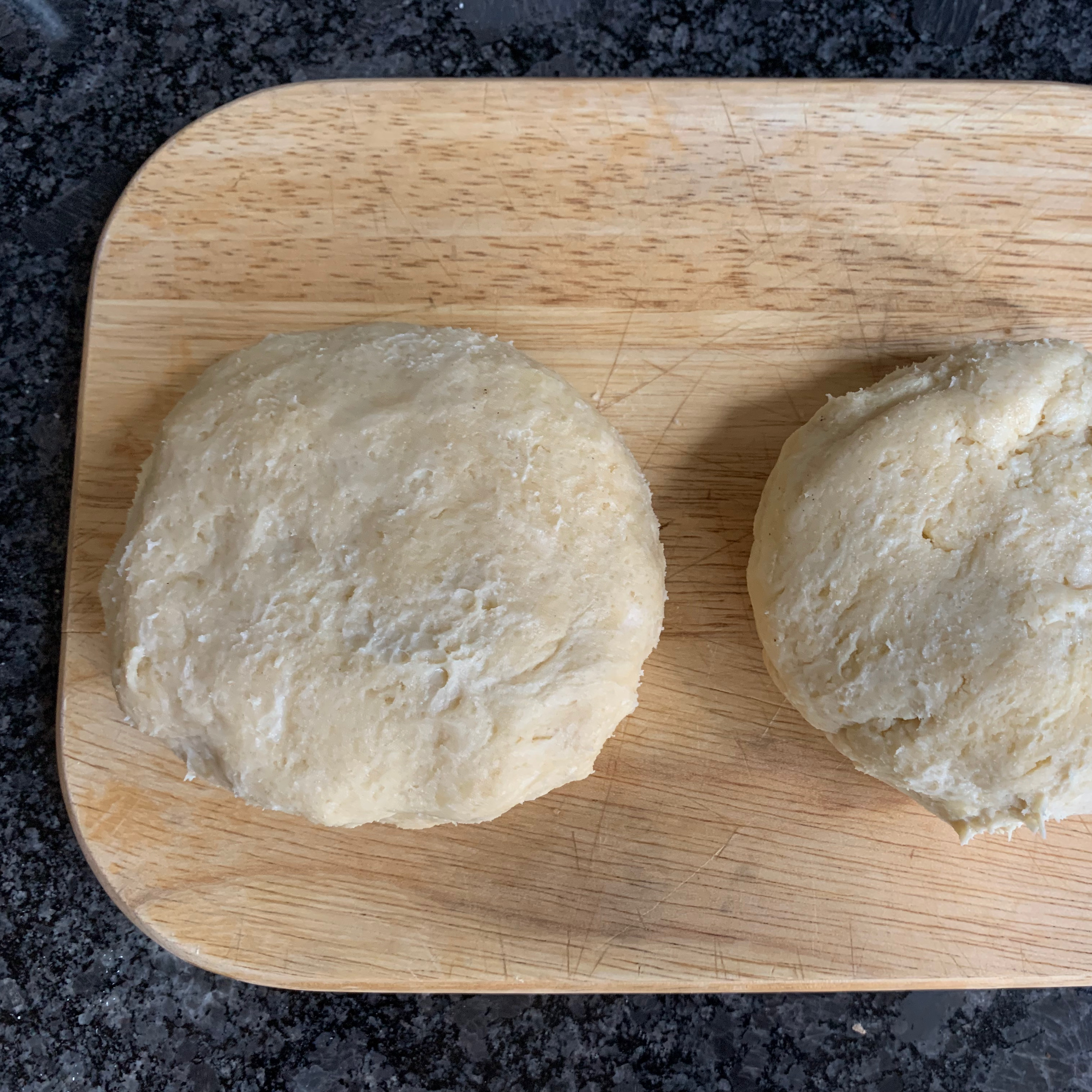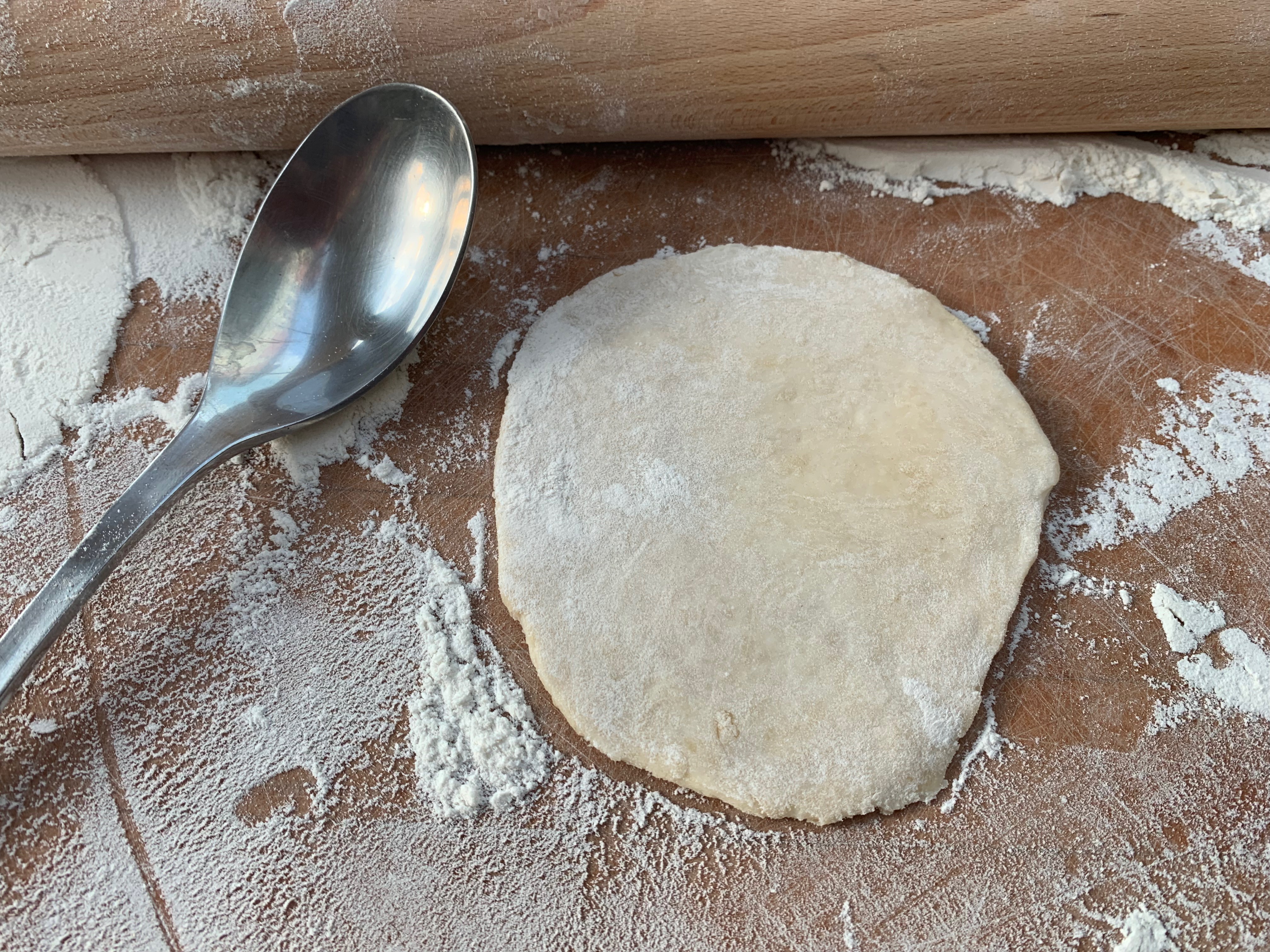 Roll out a ball of dough into as good a circle as you can manage, perhaps 10-12cm in diameter.