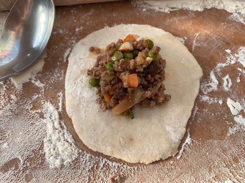 Spoon a ball of filling into the middle of your circle. I used about two dessertspoonfuls of filling per empanada.