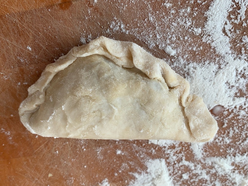 Pick up two opposite edges of the circle and fold them together; then squeeze together all the way round the semicircle. You want to get all the air out and distribute the filling nicely while being sure that the dough doesn’t tear and the filling doesn’t leak out of the edge.
