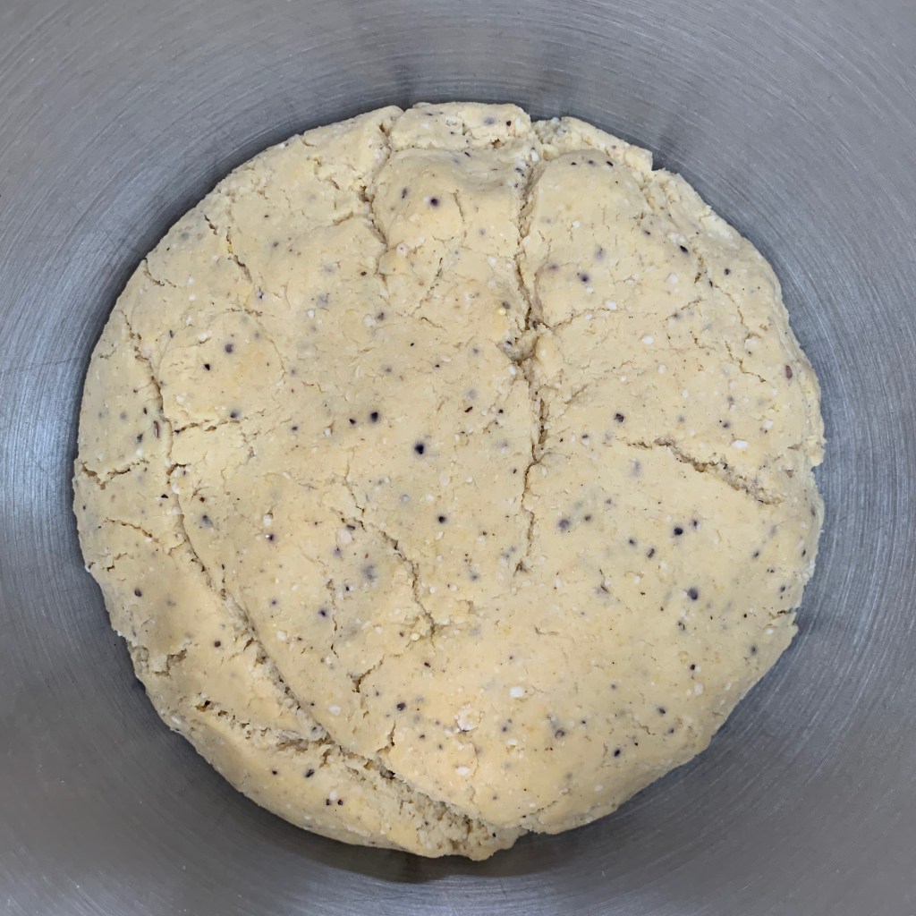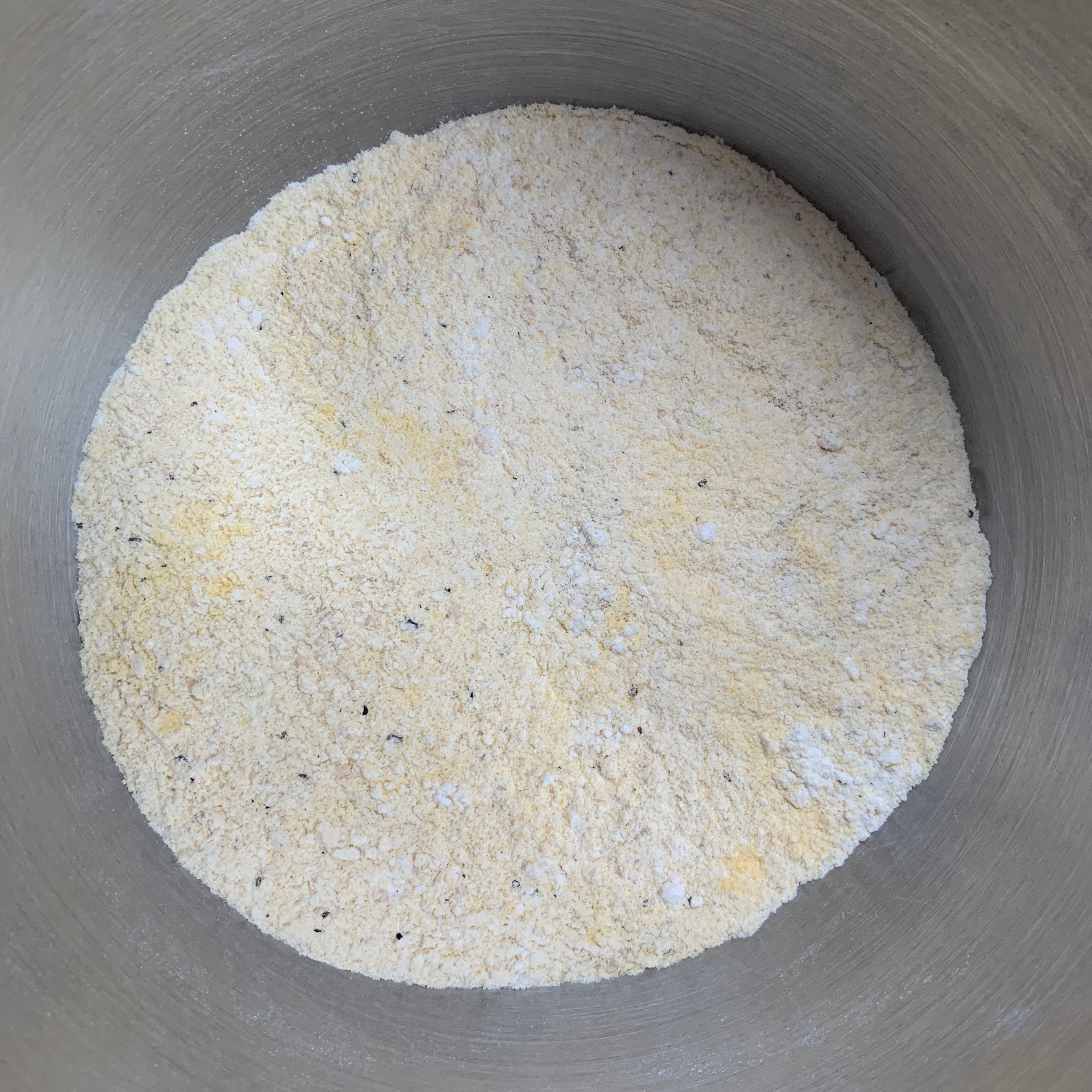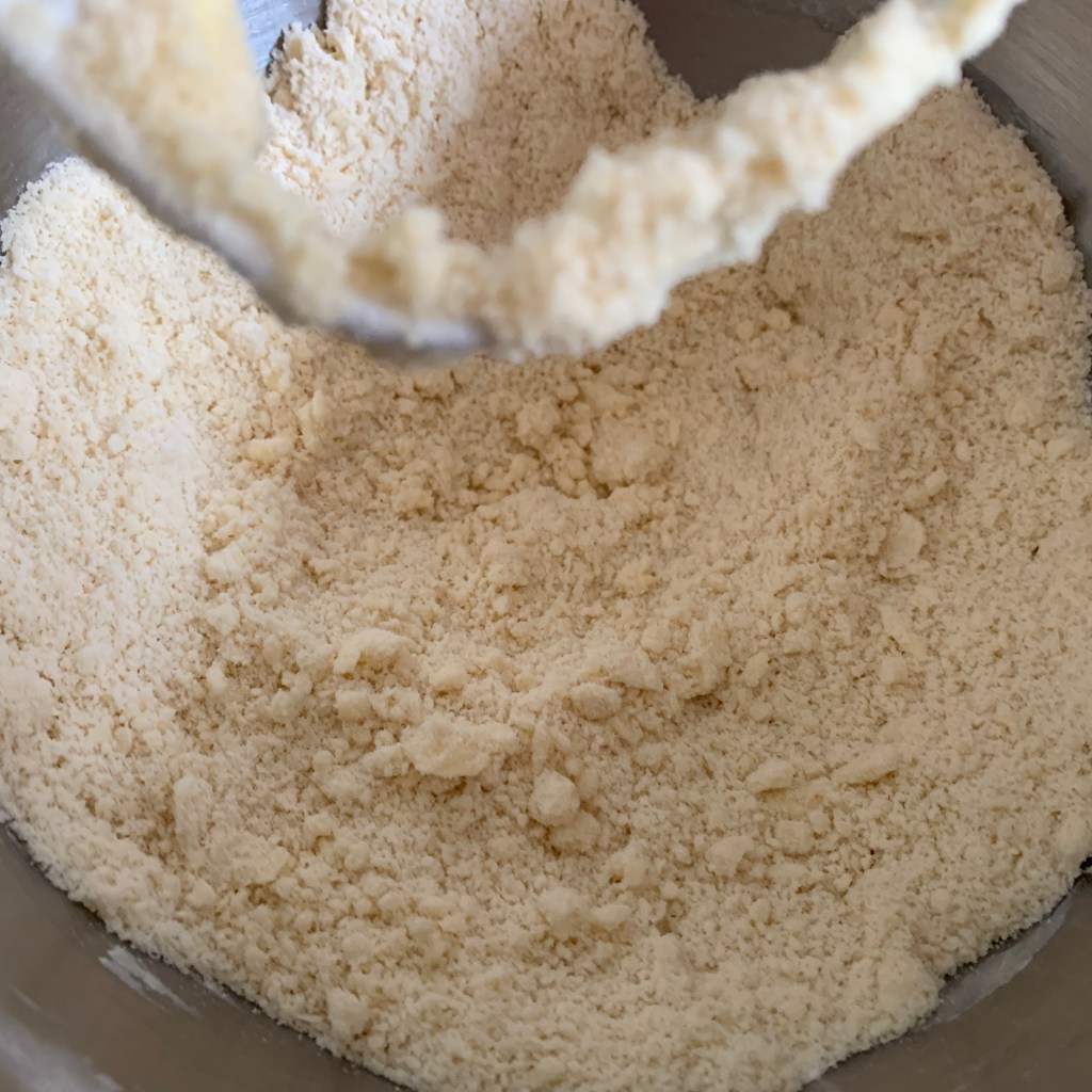 Add the butter to the flour mix and mix with the standard beater on the lowest setting until the largest lumps of butter are gone.