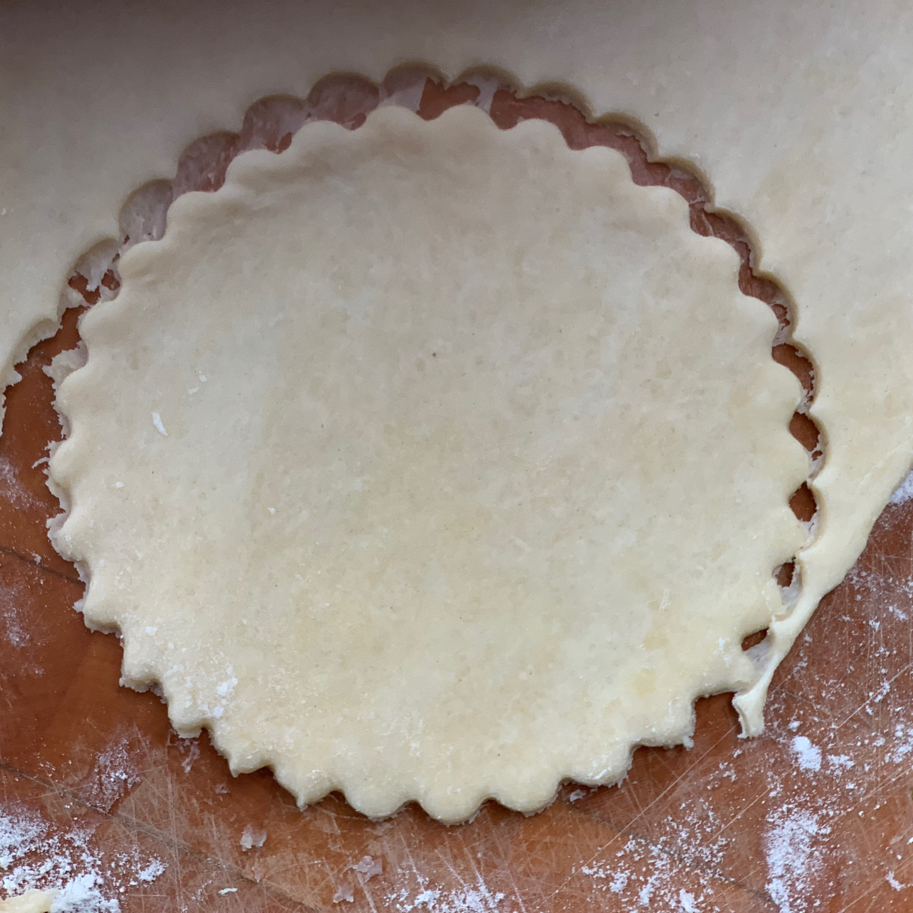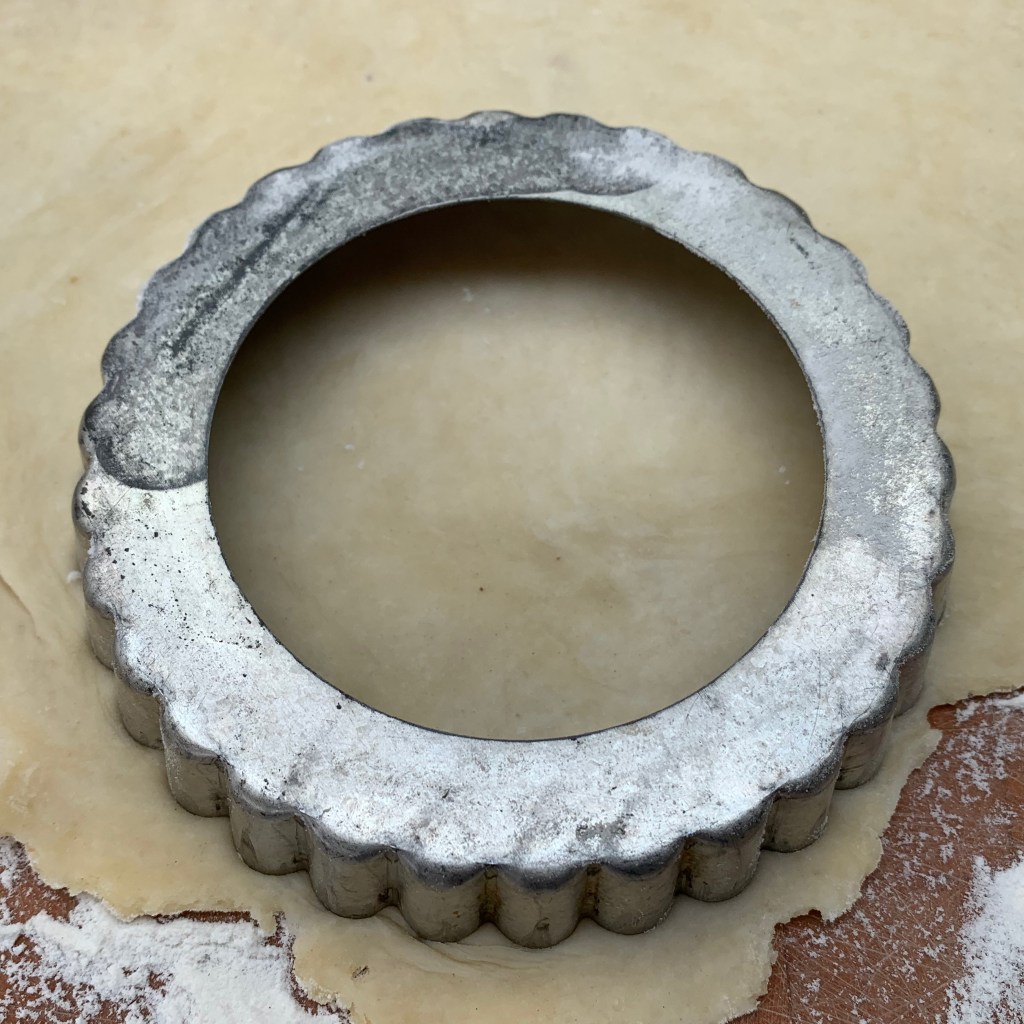 Roll out your pastry thinly and cut out a circle around 12cm in diameter – you’ll be trying to get six tartlets out of each of your two balls of dough. Use the cutting tool of your choice: mine was an inverted fluted tartlet tin which happened to be the right size.