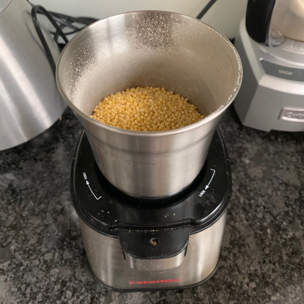 Millet flour and cowpea flour are hard to find in the UK, but it’s easy enough to get millet and black-eyed peas: a coffee grinder turns them into flour with no difficulty.