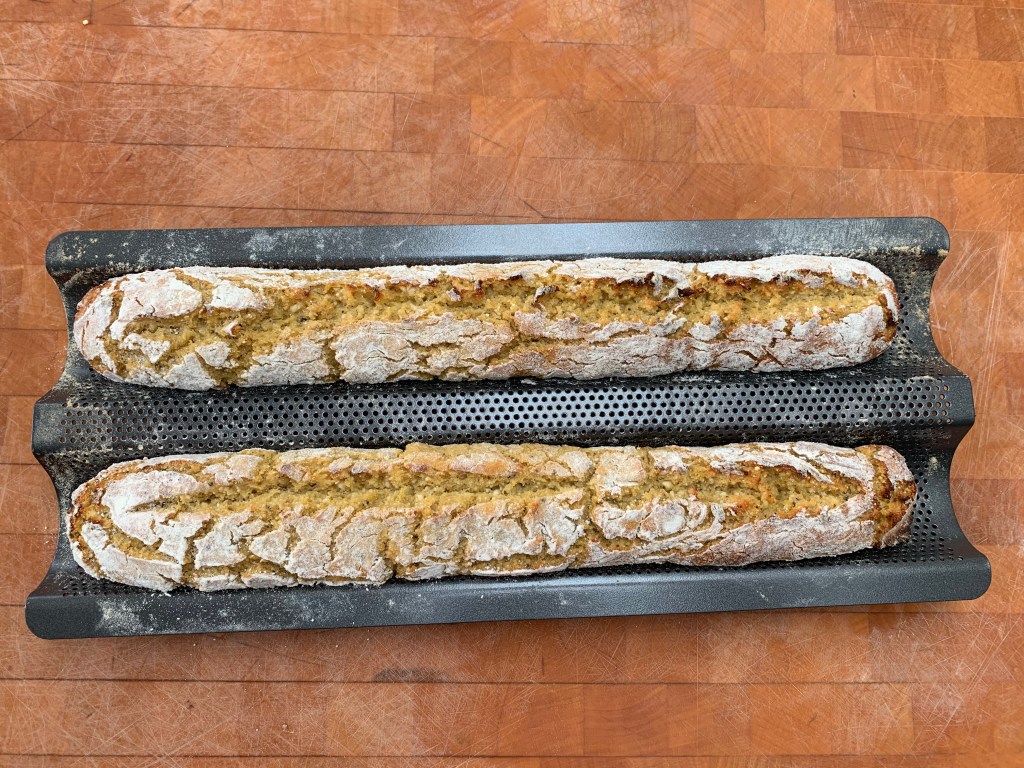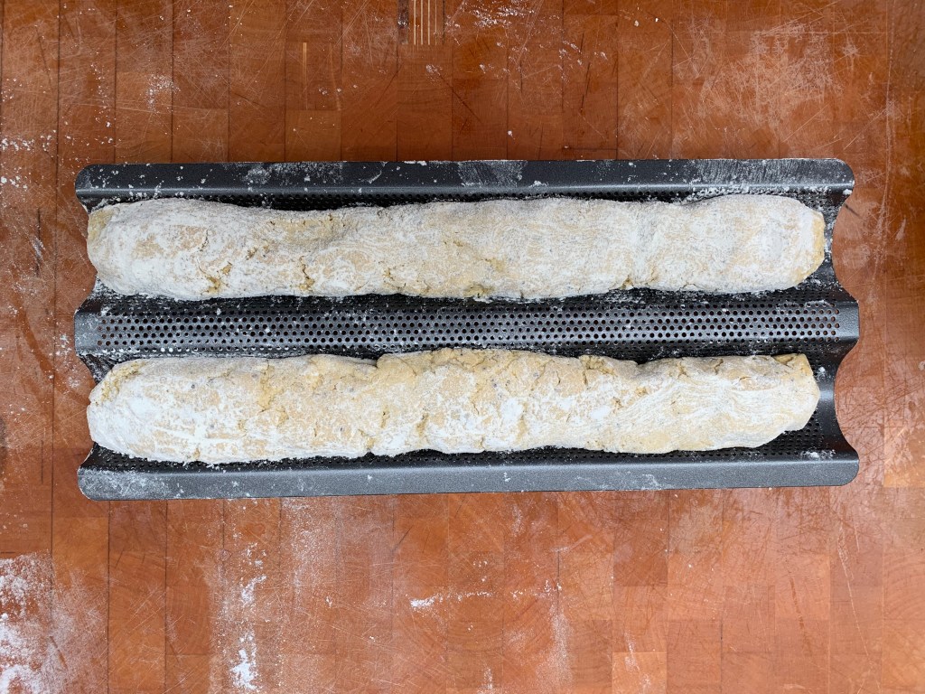 Split the dough into two and form each half into a baguette shape. I happen to have a specially shaped tin for baguettes, but you can probably get away with just putting them on a greased baking sheet.