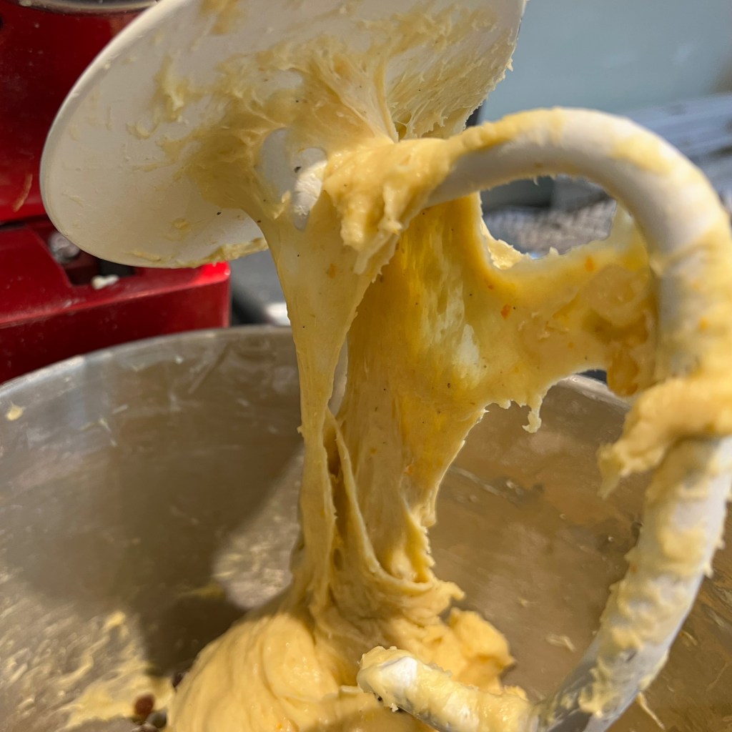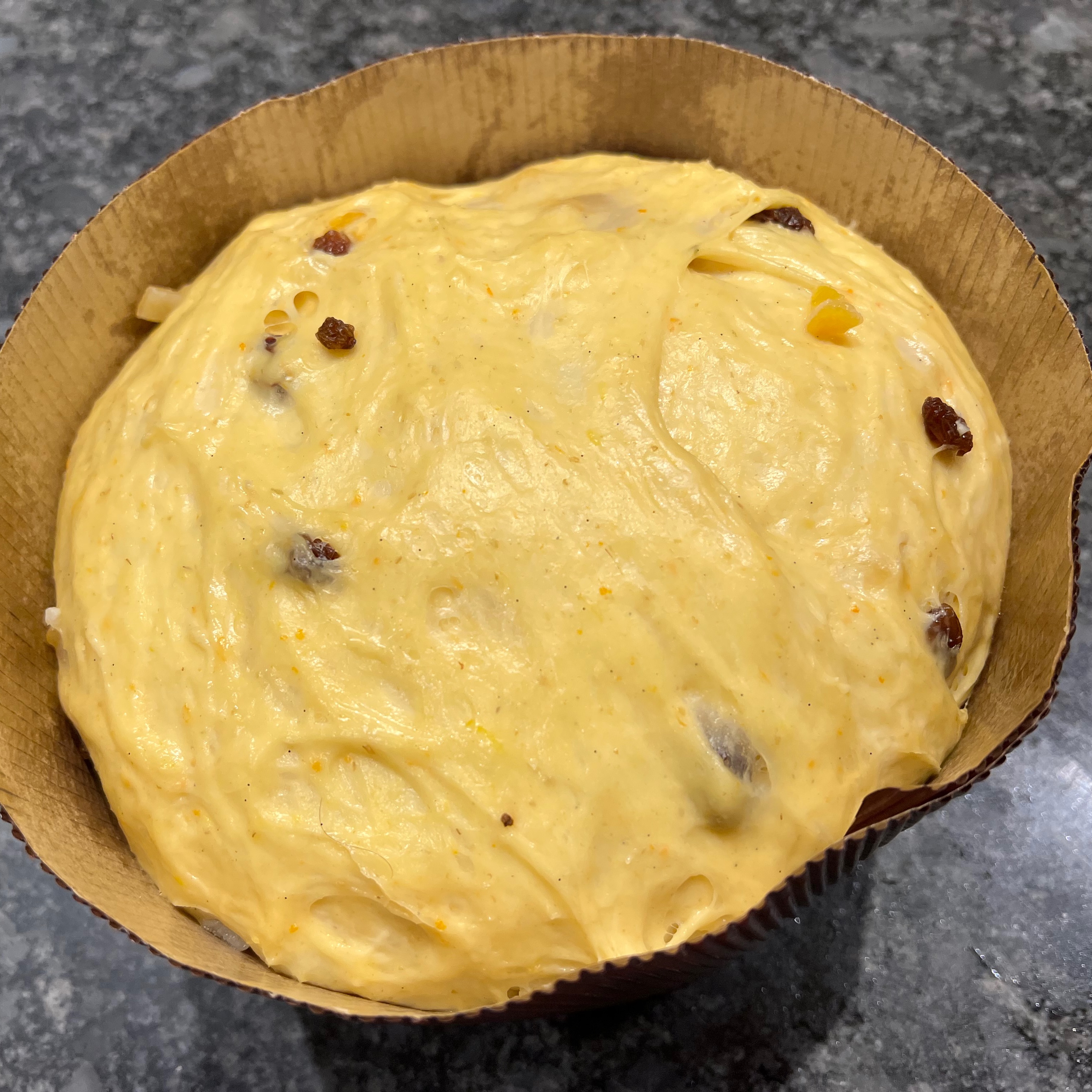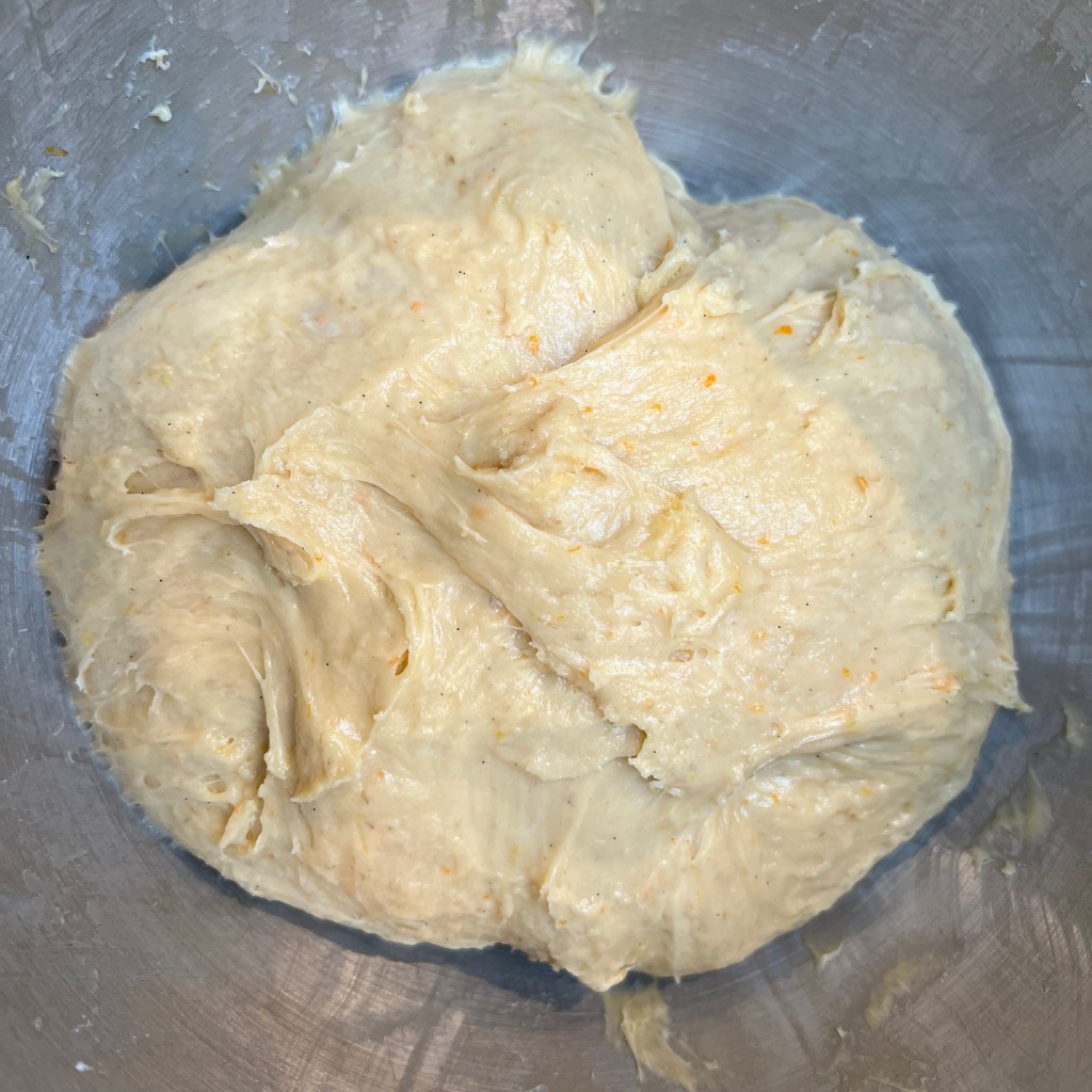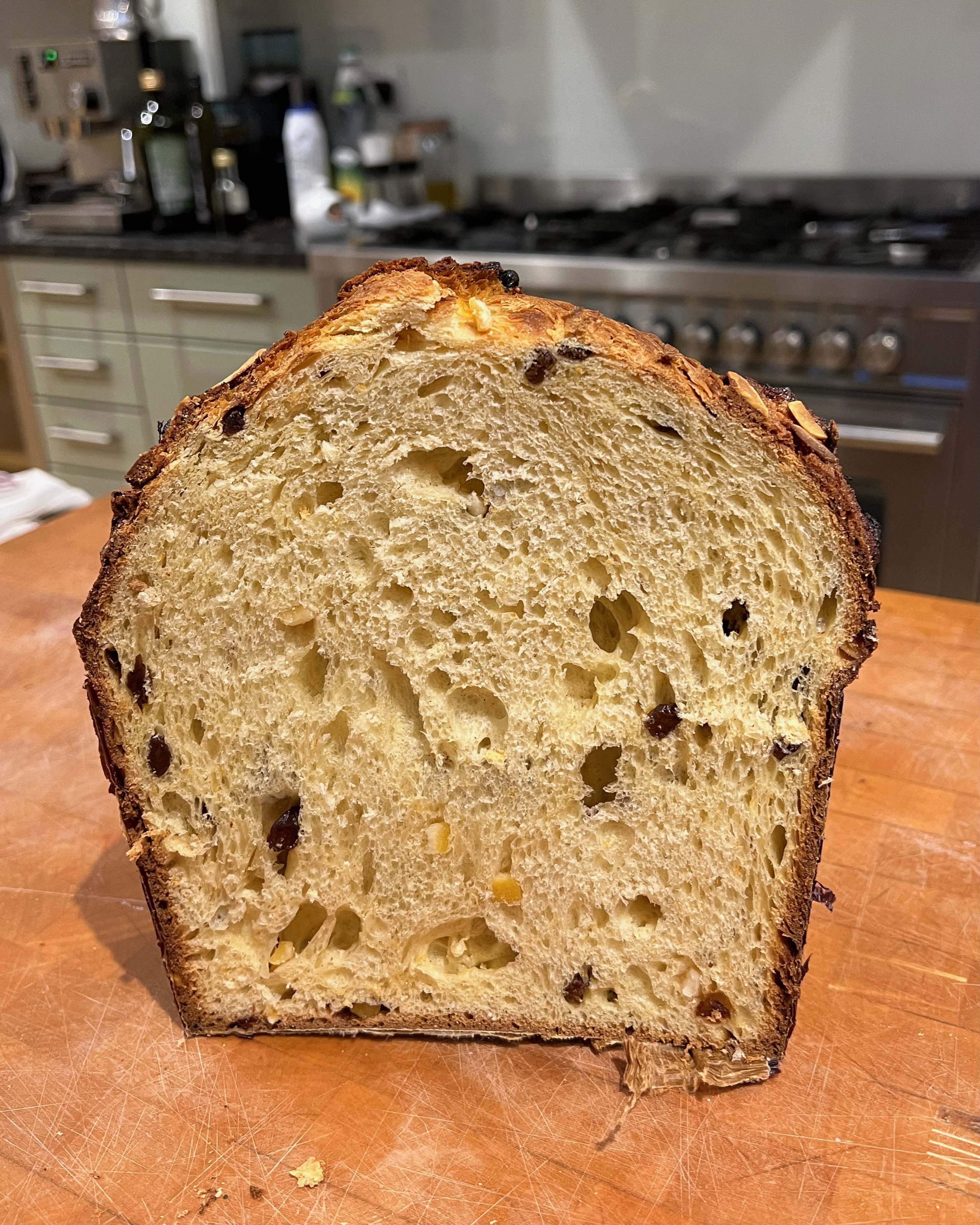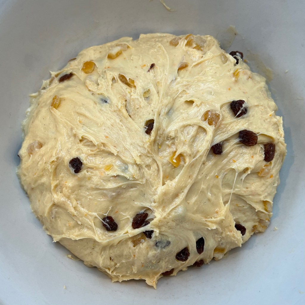 I ended up taking bits and pieces from several different recipes: Giallo Zaferrano, Great Italian Chefs, BBC Good Food. But rather than slavishly following a set of quantities and times, I relied more on getting the dough to look right at each stage, with my main reference being this video from chefsteps.com. You’ll see from the photos that my texture came out perfectly – I couldn’t have asked for better. However, my flavours beed adjusting for next time: I used a bit too much salt and not enough sugar and I was definitely too conservative about how much candied fruit to add. I’ve adjusted the quantities below to what I think I should have used (and will try for next Christmas).