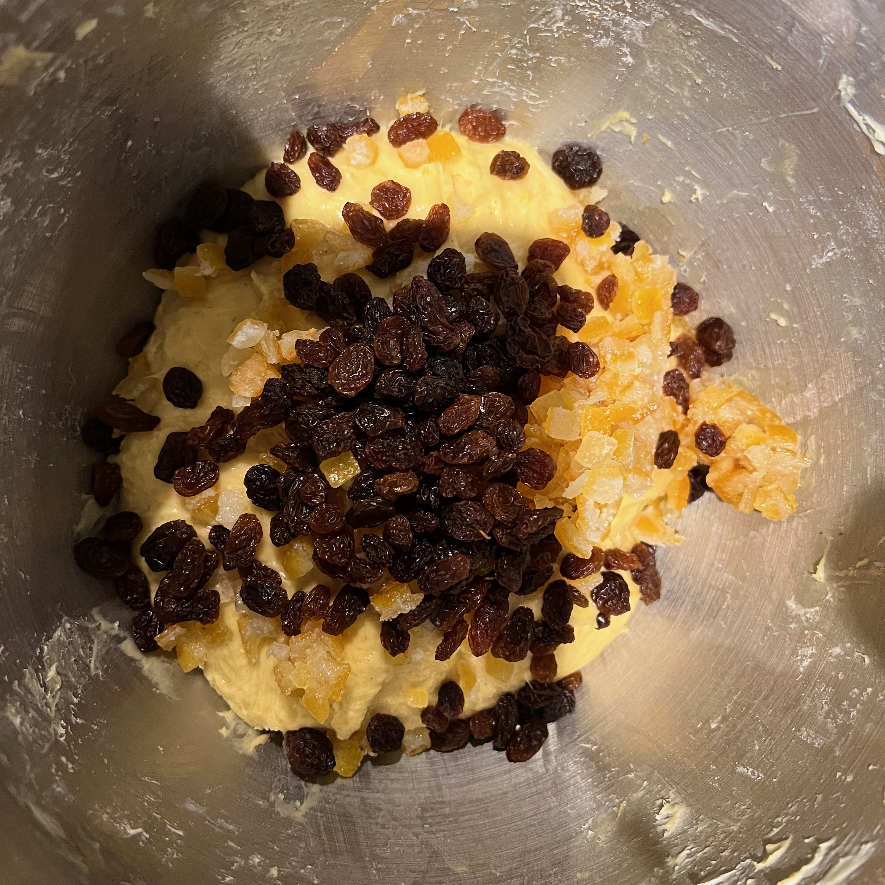 - Add the vanilla, the lemon and orange zest, the salt and the dried fruit, and carry on mixing until the fruit is nicely coated in dough – this is what will stop if from sinking to the bottom of your panettone during baking.