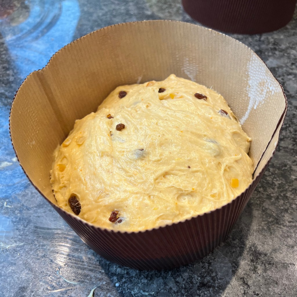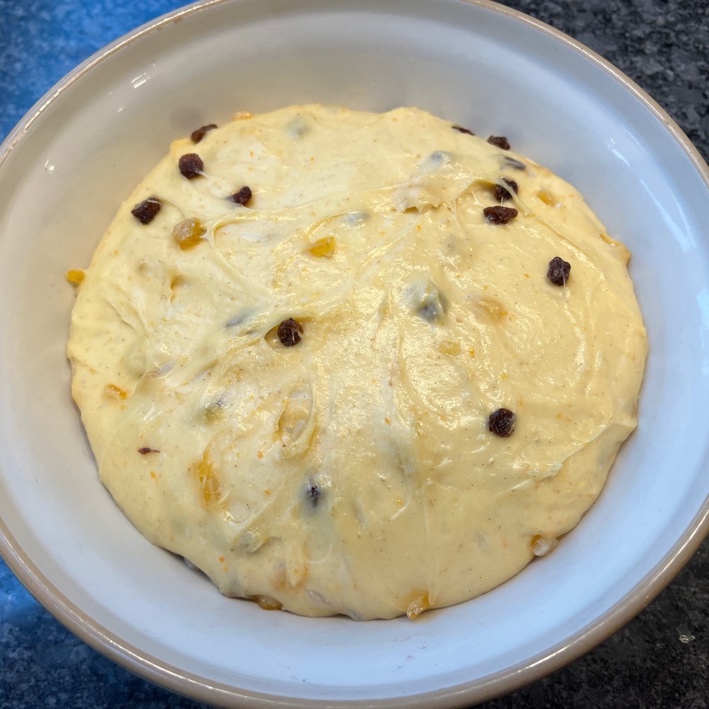 Making panettone turns out to be something of a project: it’s going to take you most of a day as an absolute minimum, with some recipes calling for multiple resting and proving stages taking several days, in order to develop the flavour to its maximum. I went for an intermediate, starting with a sourdough “sponge” at 6pm on day 1 and getting the panettone out of the oven around 24 hours later, to be cooled and ready for breakfast the next morning.