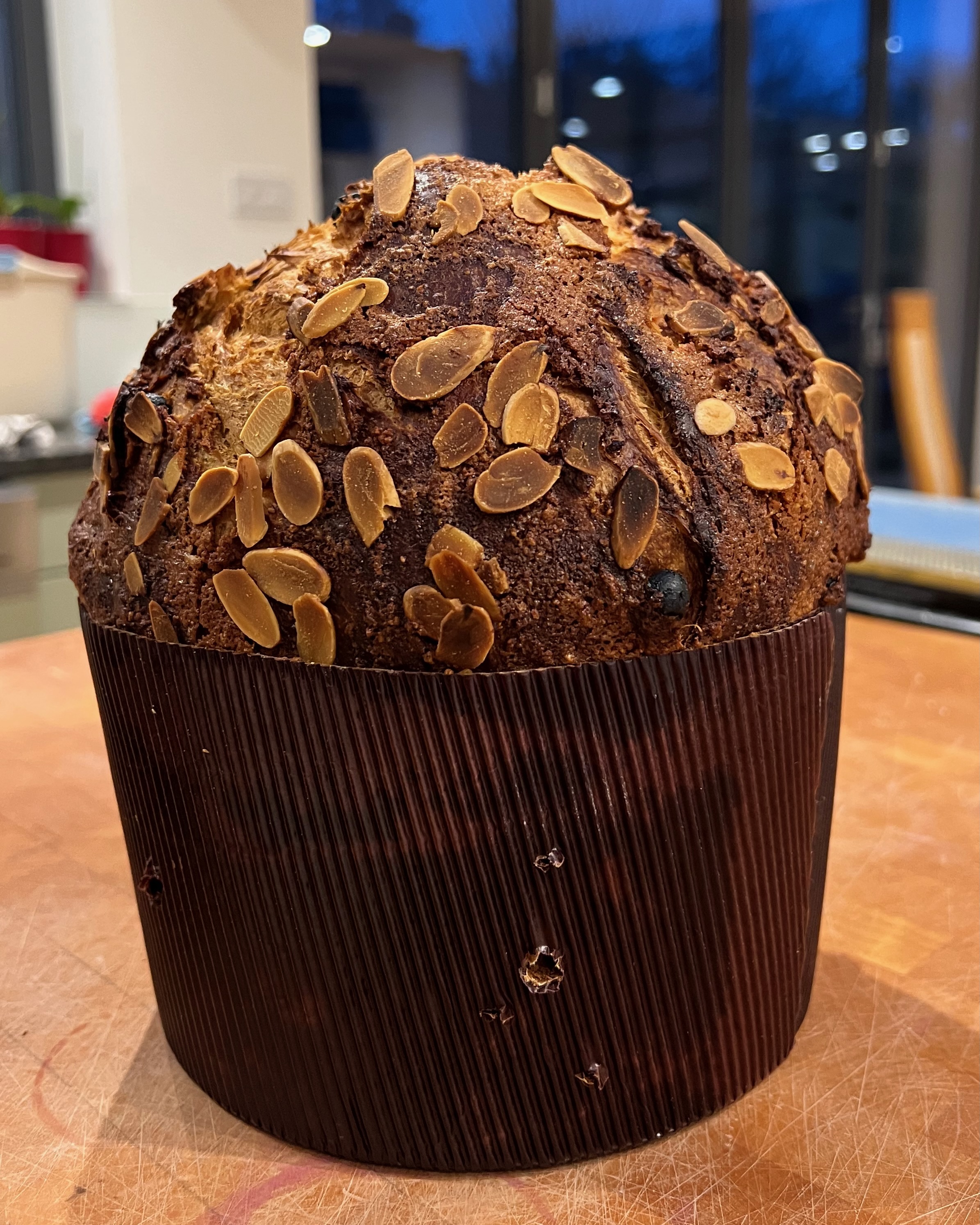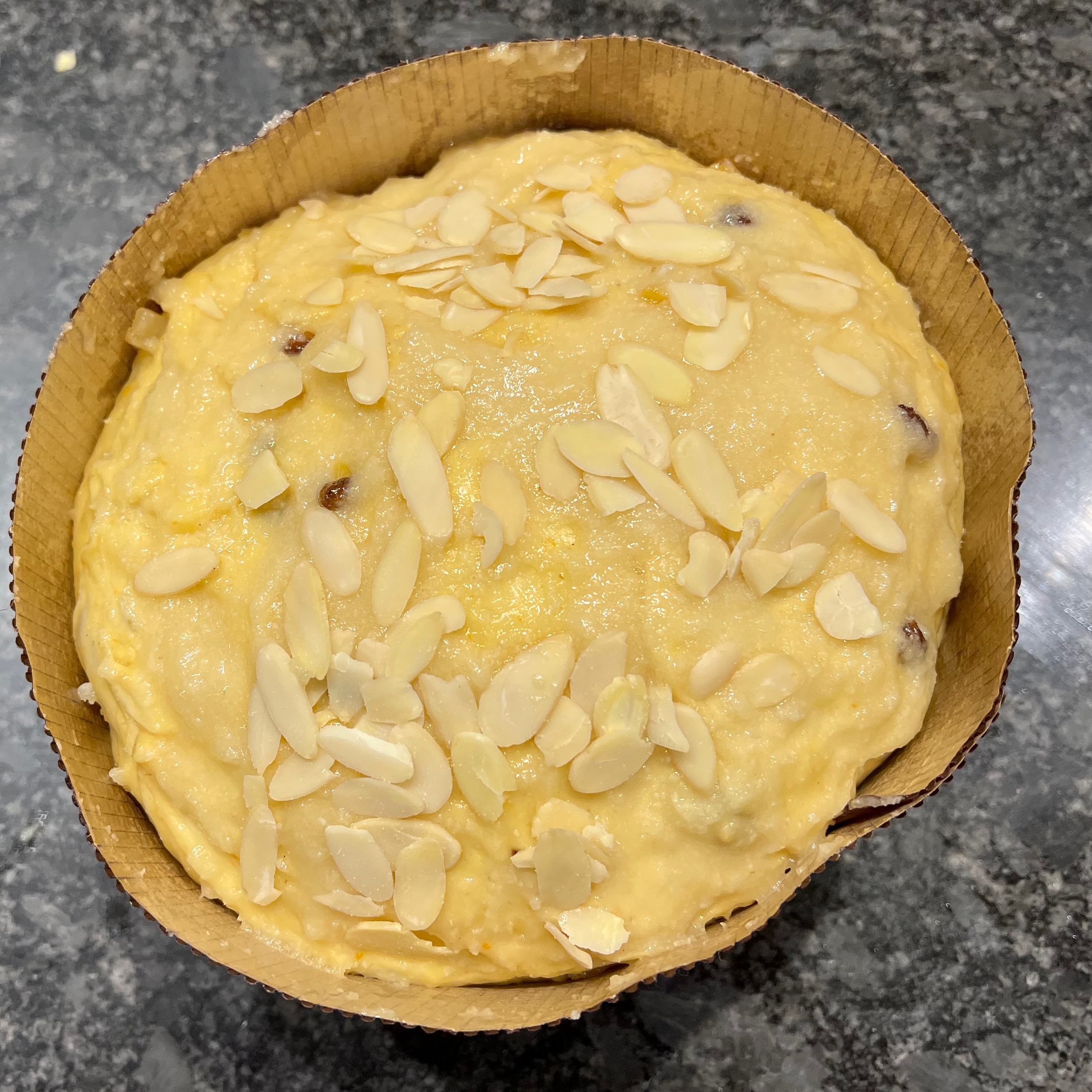 - Scatter the ground almonds over the glazed panettone. You can press them in a tiny amount, but again, don’t risk tearing the surface.