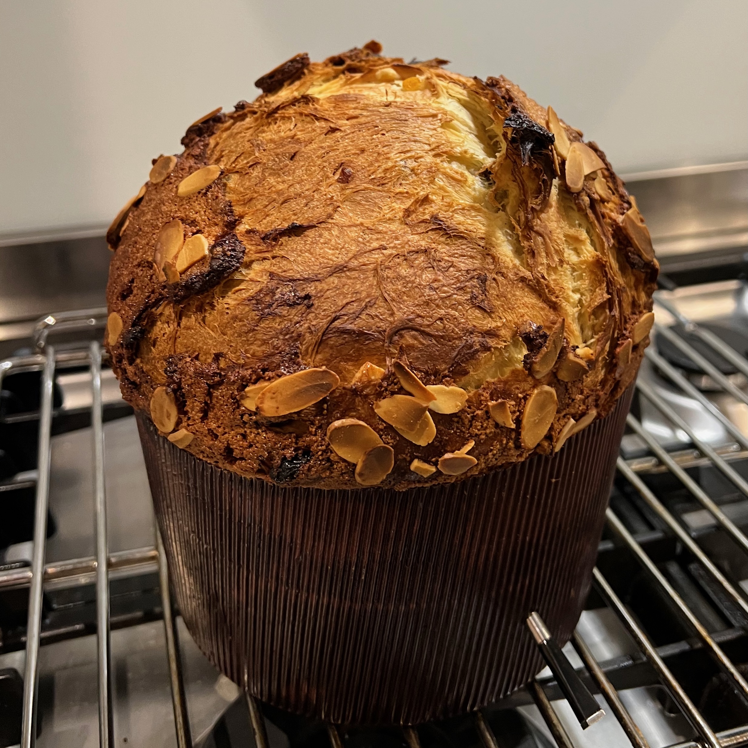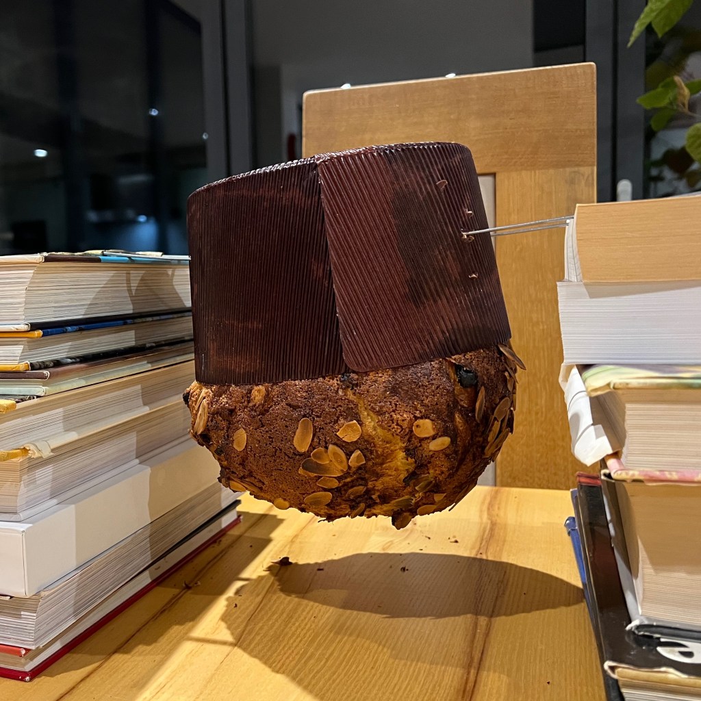 - When the panettone comes out the oven, hang it upside down to cool for at least 12 hours before serving. There are various ways of doing this: most involve knitting needles or, in my case, Turkish kebab skewers. As you’ll see from the photos, I poked two skewers through the loaf and balanced the whole lot on a pair of towers of cookbooks. It was rustic, but it worked.