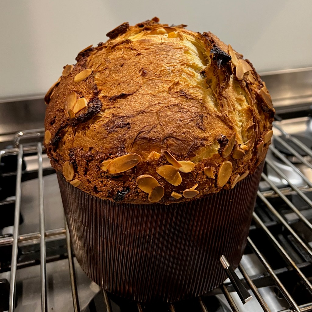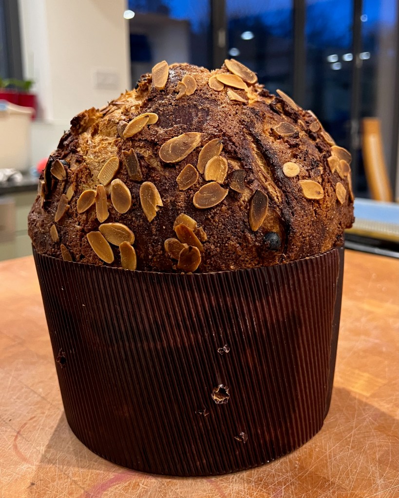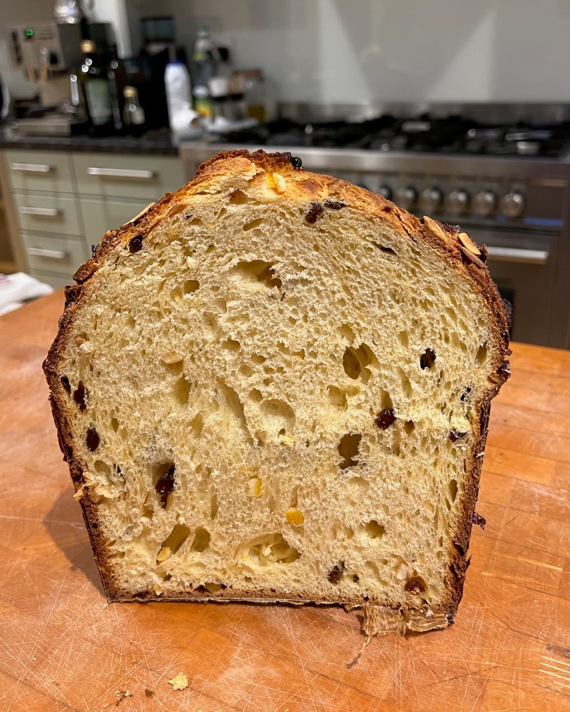 Christmas food in Italy is a whole lot more varied than in England, with all manner of different meats, fish, pasta dishes, cakes and biscuits (mercifully, the Italians don’t share our obsession with roast turkey). But there’s one thing that you’ll see at Christmas all over Italy: the cylindrical, sweetened, enriched bread called “Panettone” – the “big loaf”. Whenever I’ve been to a café in Italy at Christmas time, usually in or near Milan, the base of modern, industrial scale panettone manufacture and said to be its city of origin, piles of panettone pieces have been arrayed on the bar for everyone to nibble with their coffee. The aroma of citrus and vanilla in a bread of extreme fluffiness is unbeatable.