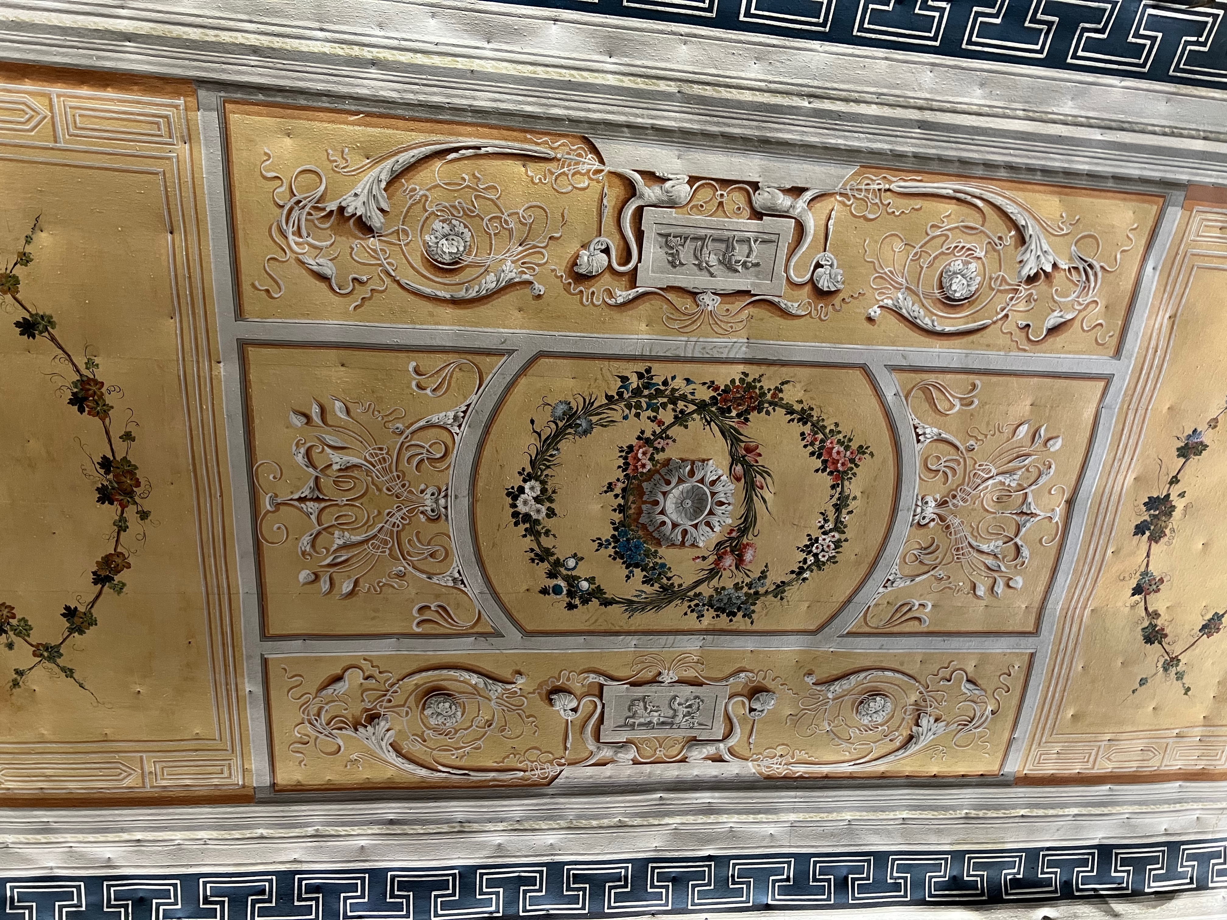 We stayed in a lovely B&B, the Casa Santangelo in Salerno’s Centro Storico, once the apartment of an Italian marquis and now converted into some very smart suites. I couldn’t resist including this photo of our bedroom’s trompe l’oeil ceiling, painted onto fabric and tacked to the framework above.
