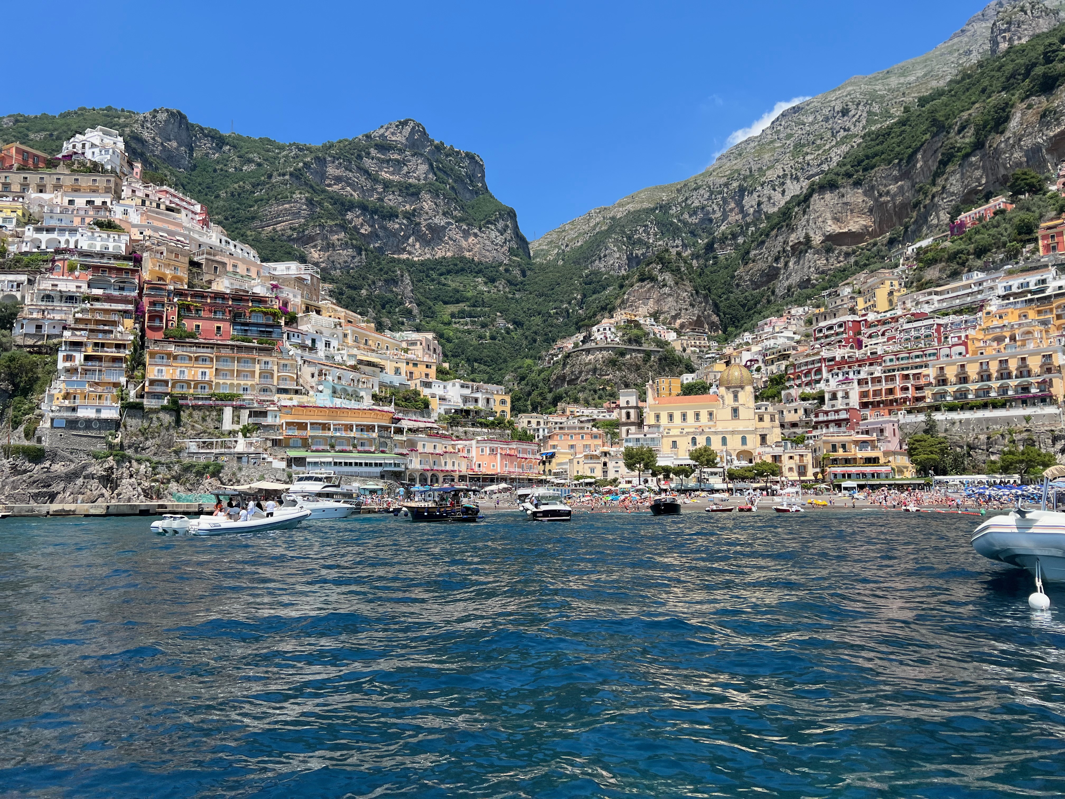 Sophia Loren’s villa is not far, with its mildly alarming open elevator to take Ms Loren from the house down the cliff drop towards the sea. I have to agree with the Italian friends who told us that the best views of the Amalfi Coast are to be had from the sea. Salerno turns out to be a good place to start a boat trip: go to Molo Manfredi marina and you’ll find several companies happy to rent you a boat, either with or without a skipper; for the cost conscious, joining a tour will make more sense than doing a private rental. There are fewer companies than the internet would appear to indicate, so you’ll find the same boats on offer on several different websites, aggregators or otherwise (for example, we started on “Blue Dream Rentals” and ended up renting from “Blu Mediterraneo”). The boat was fine and our skipper was very personable. We chose an intinerary that started at Salerno, proceeded to Positano (past Amalfi to the West) and then back via a stop for lunch. The photo here is of Positano, as glitzy as you can get and apparently the favoured ancharage for oligarchs’ superyachts (we saw five very large yachts moored there). You can also go to Capri, but that’s a longer trip and if you want to spend a substantial time going round Capri, you might prefer one of the many fast ferries and hydrofoils and then get a boat when you’re there. Alternatively, start your trip from further West along the coast: there are popular trips to Capri both from Amalfi and from Naples itself.